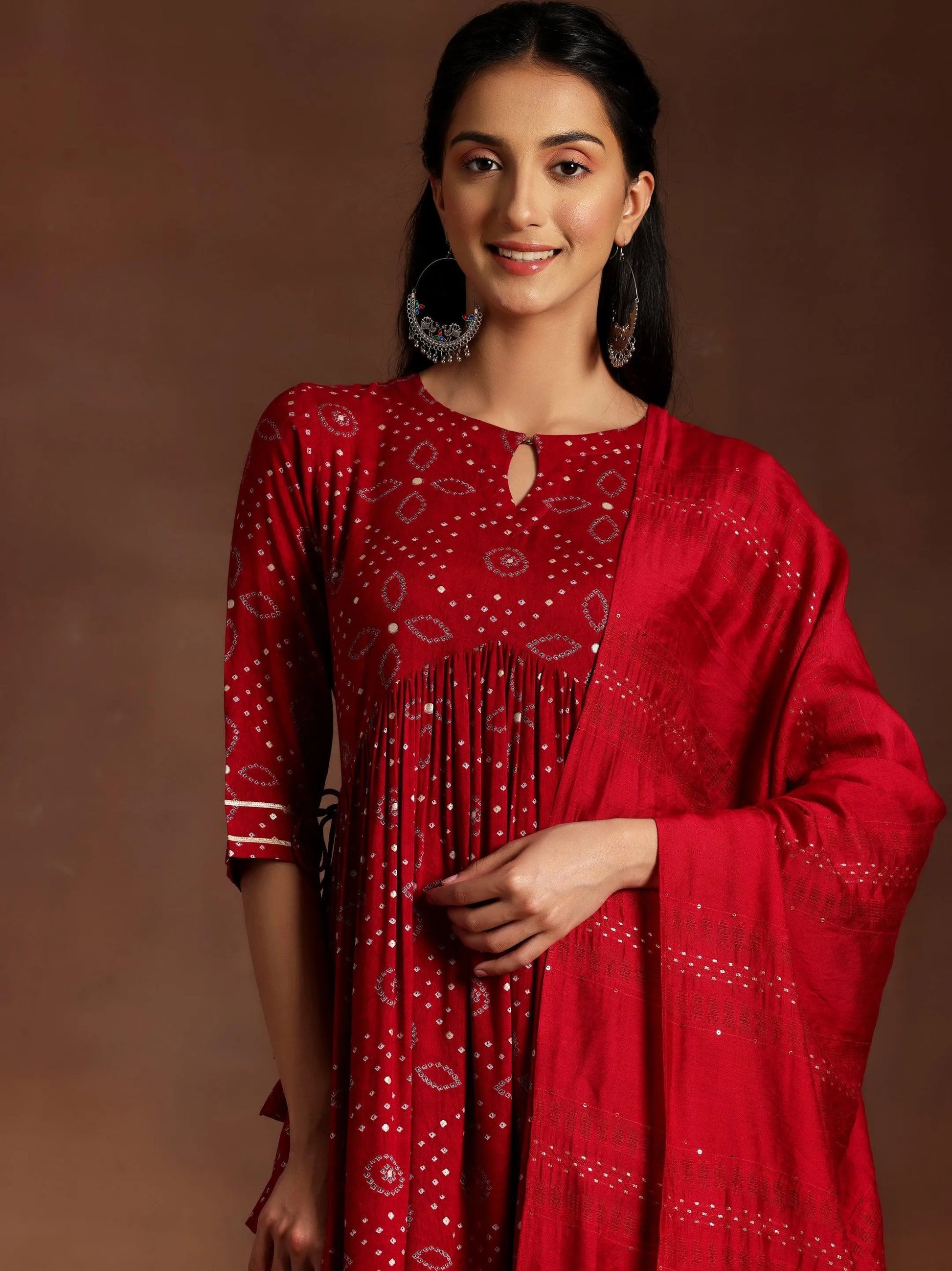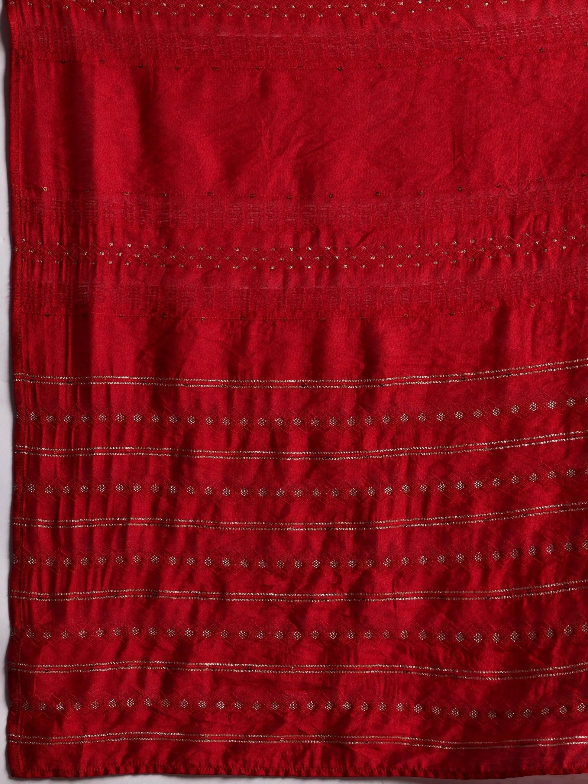 Our 3-piece red printed suit set, crafted in viscose rayon fabric, features an A-line kurta with a keyhole neckline and three-quarter sleeves. Complemented with trousers with a partially elasticated waistband and roomy pockets, and a dupatta. Adorned with sequins accents, tassels, and Gota Patti detailing, this style is perfect for light festivities.