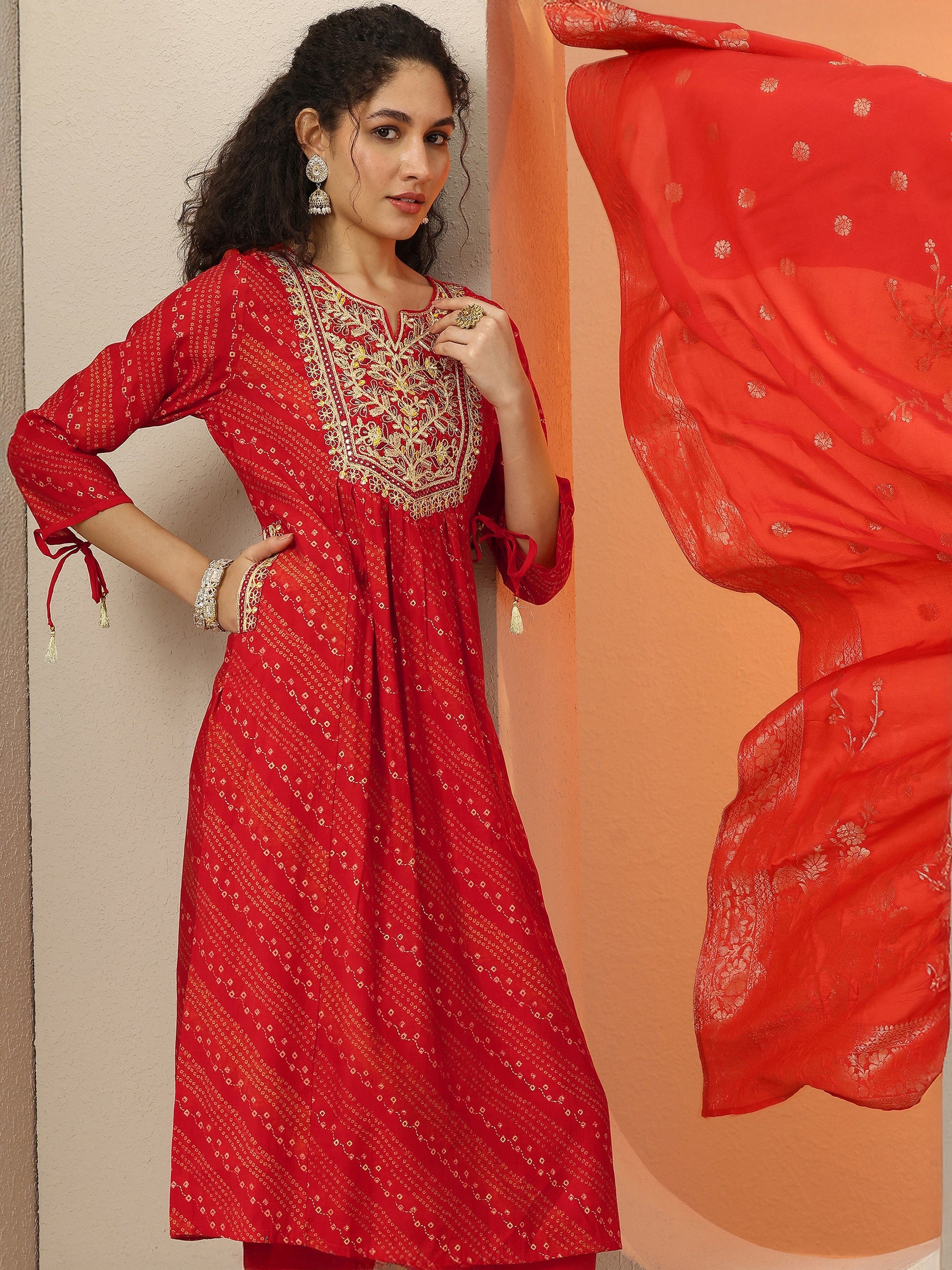 Red Printed Silk Blend A-Line Suit Set With Dupatta