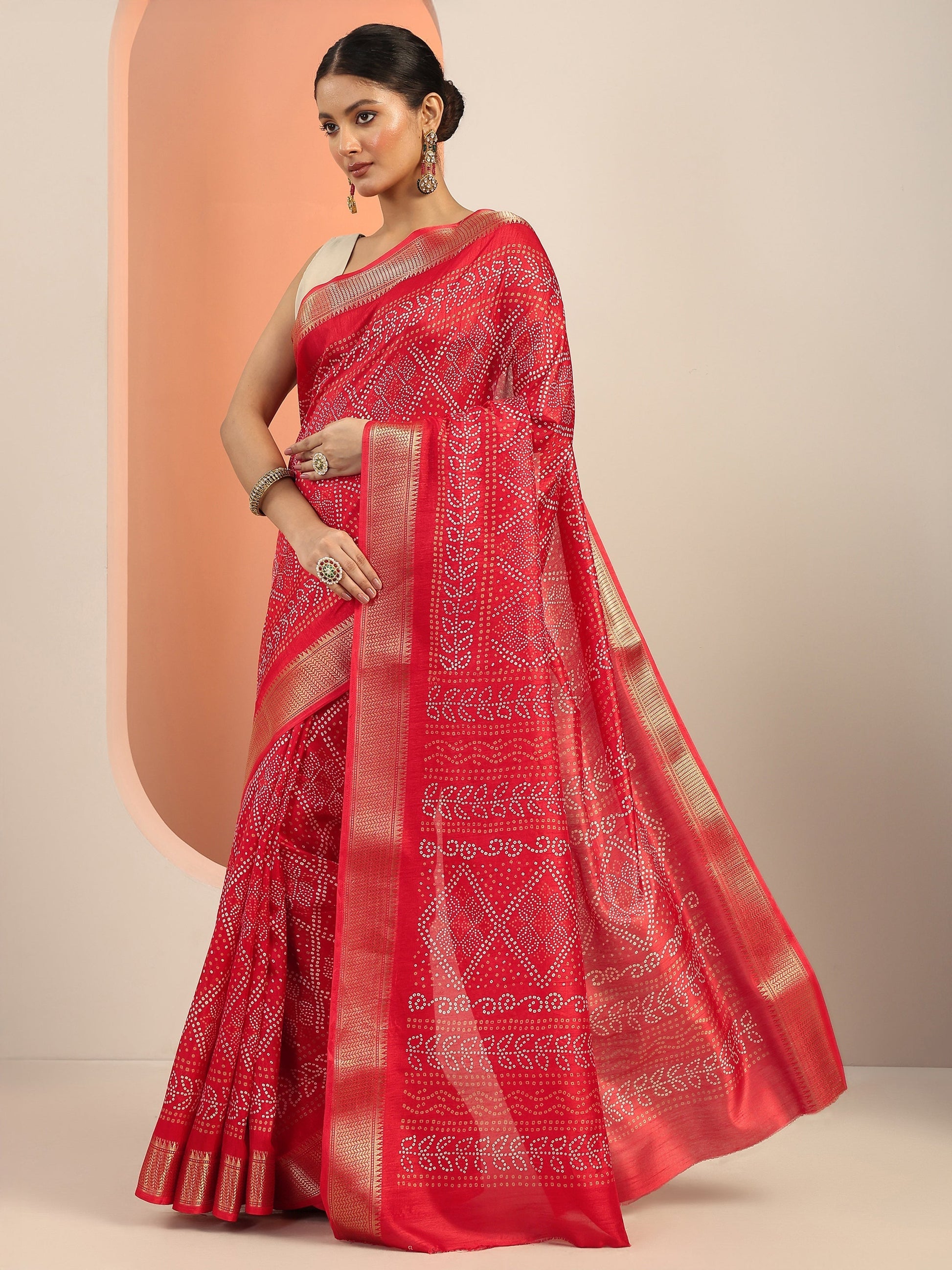 Our Red Printed Silk Blend Saree Features Captivating Bandhani Prints. Complemented With An Unstitched Blouse Piece. This Charming Saree Is Perfect For Festive Wear