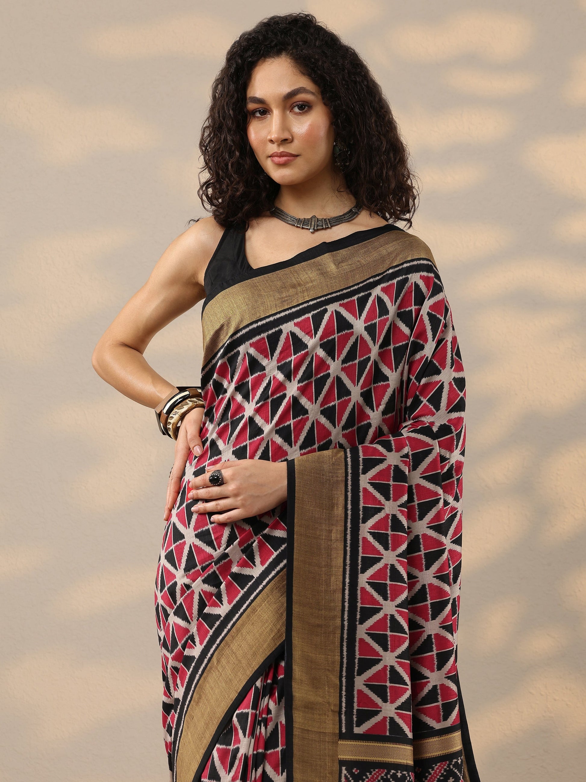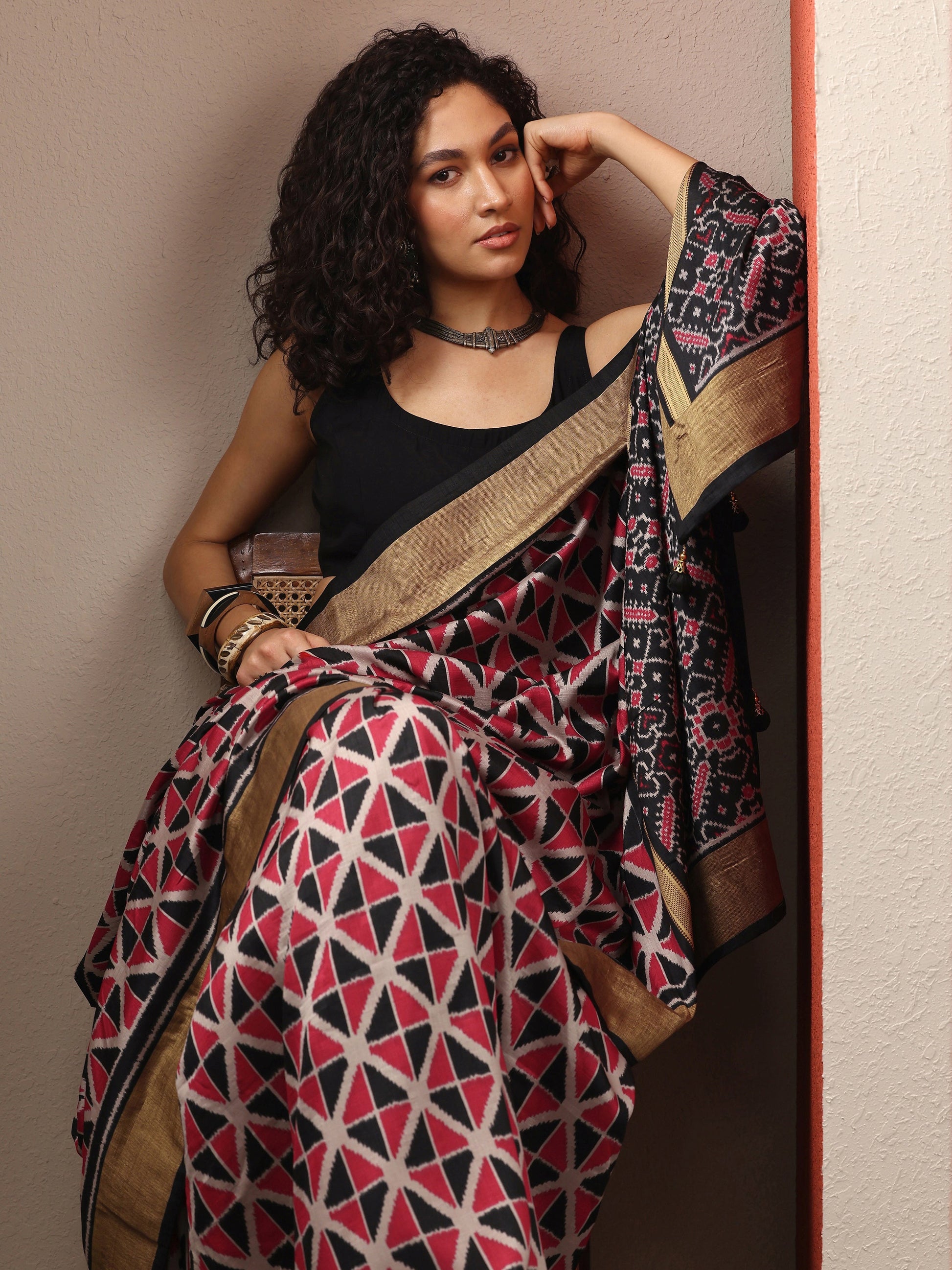 Red Printed Silk Blend Saree With Unstitched Blouse Piece