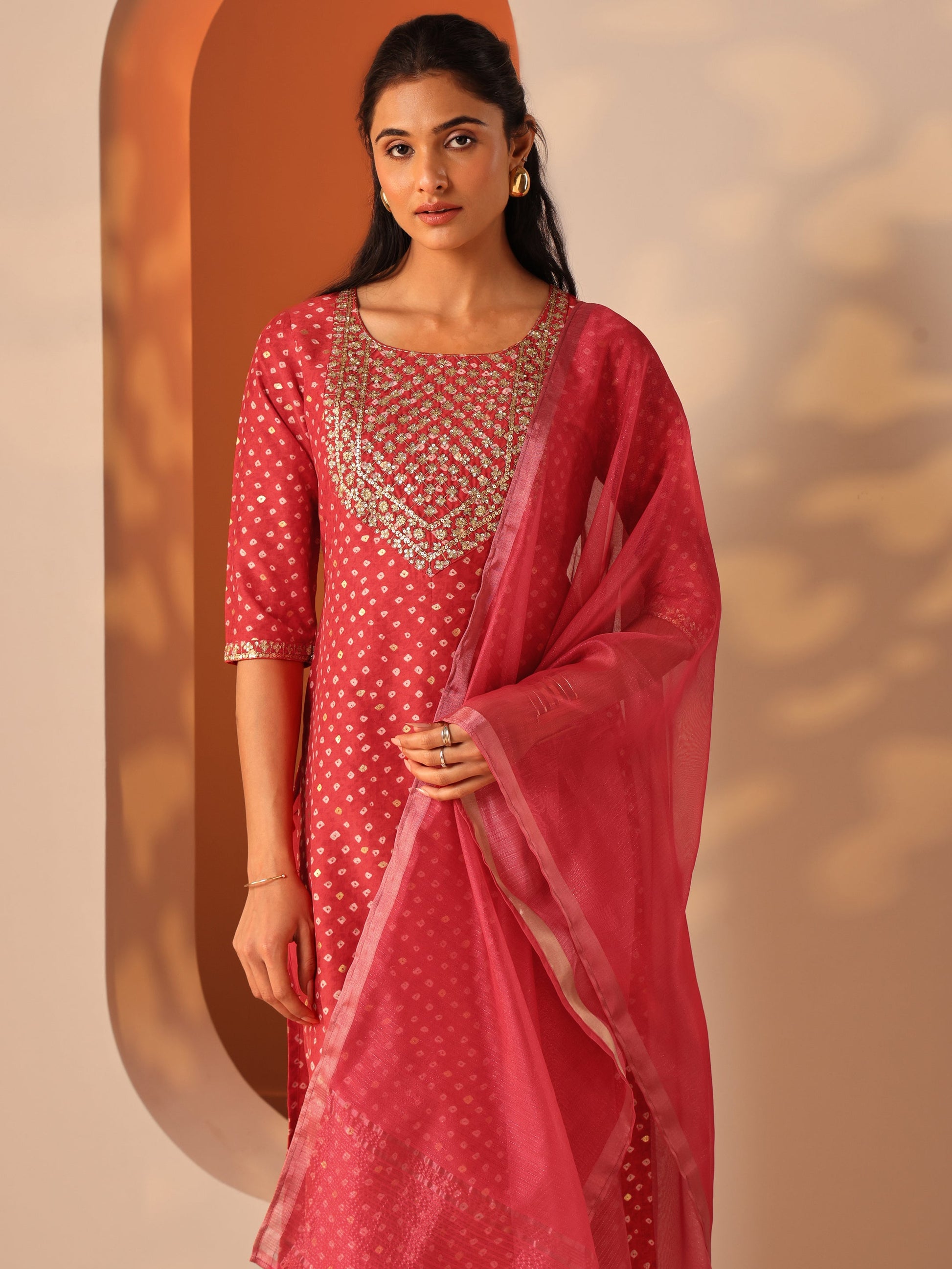 Our 3-piece Red Silk Blend Kurta Set features a Straight-fit kurta with a Round Neckline, Regular Sleeves, and statement yoke. Complemented with Straight Pants with a partially elasticated waistband, and a Solid dupatta. Adorned with Embroidered accents, this style is perfect for Festive Wear.