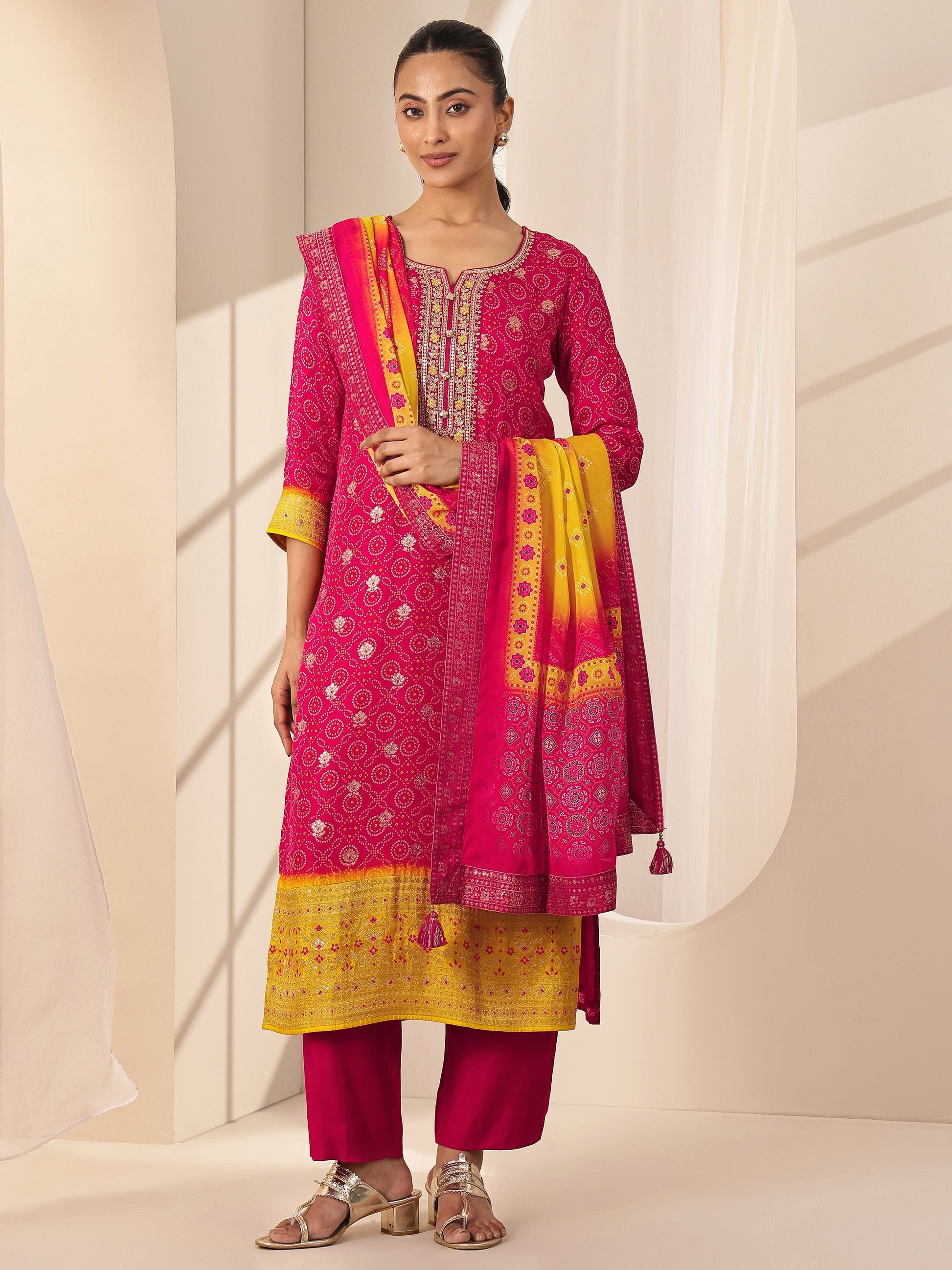 Our 3-piece Red and yellow silk blend straight-fit kurta set features a U-notched neckline, regular sleeves, and a statement yoke. Complemented with straight pants with an elasticated waistband and 2 pockets, and a dupatta with a printed, Bandhani inspired print. Adorned with printed, Bandhani inspired print, this style is perfect for festive occasions.