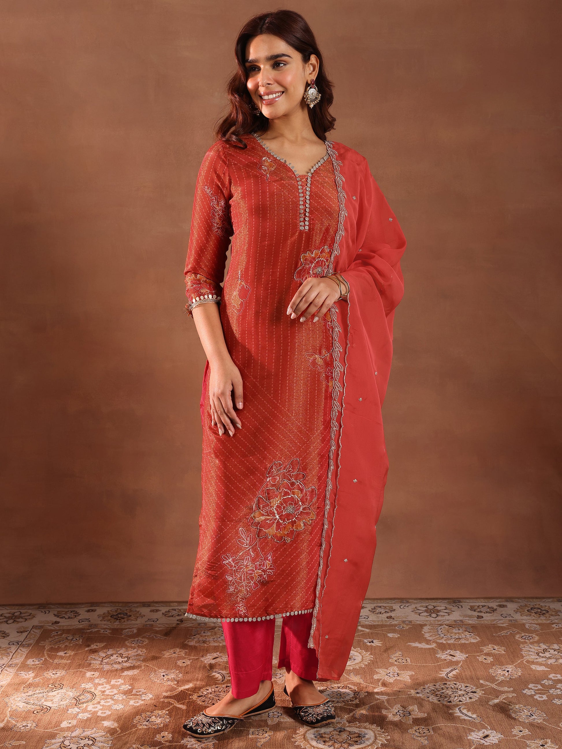 Our 3-piece Red Silk Blend Straight-fit Kurta Set features a V-neckline, Regular Sleeves, and statement yoke. Complemented with Straight Pants with an Elasticated waistband, and an Embroidered dupatta. Adorned with Embroidered accents, this style is perfect for festive occasions.