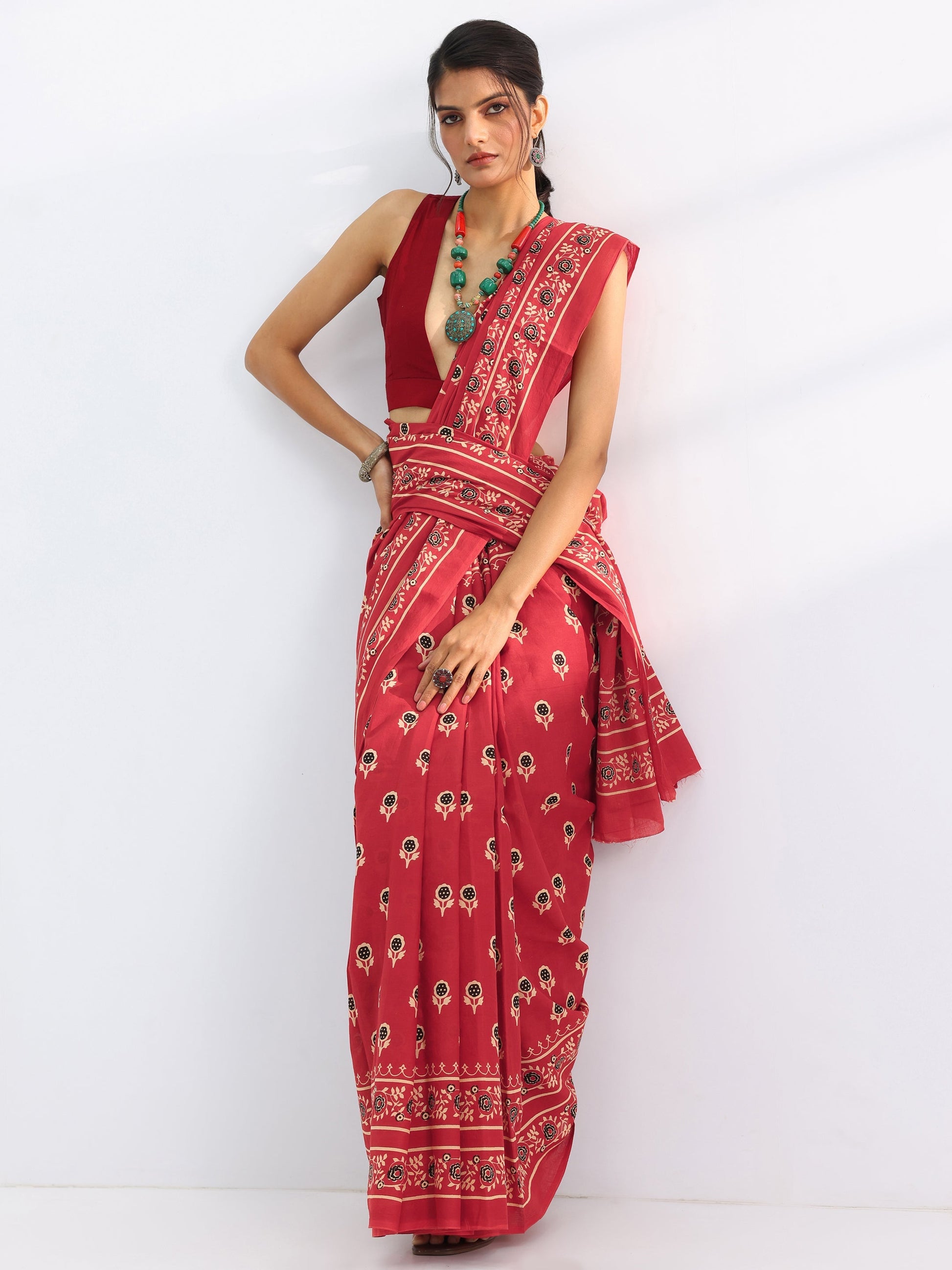 Our Red Printed Cotton Saree Features Captivating Floral Printed Design. Complemented With A Unstitched Blouse. This Charming Saree Is Perfect For Casual Wear