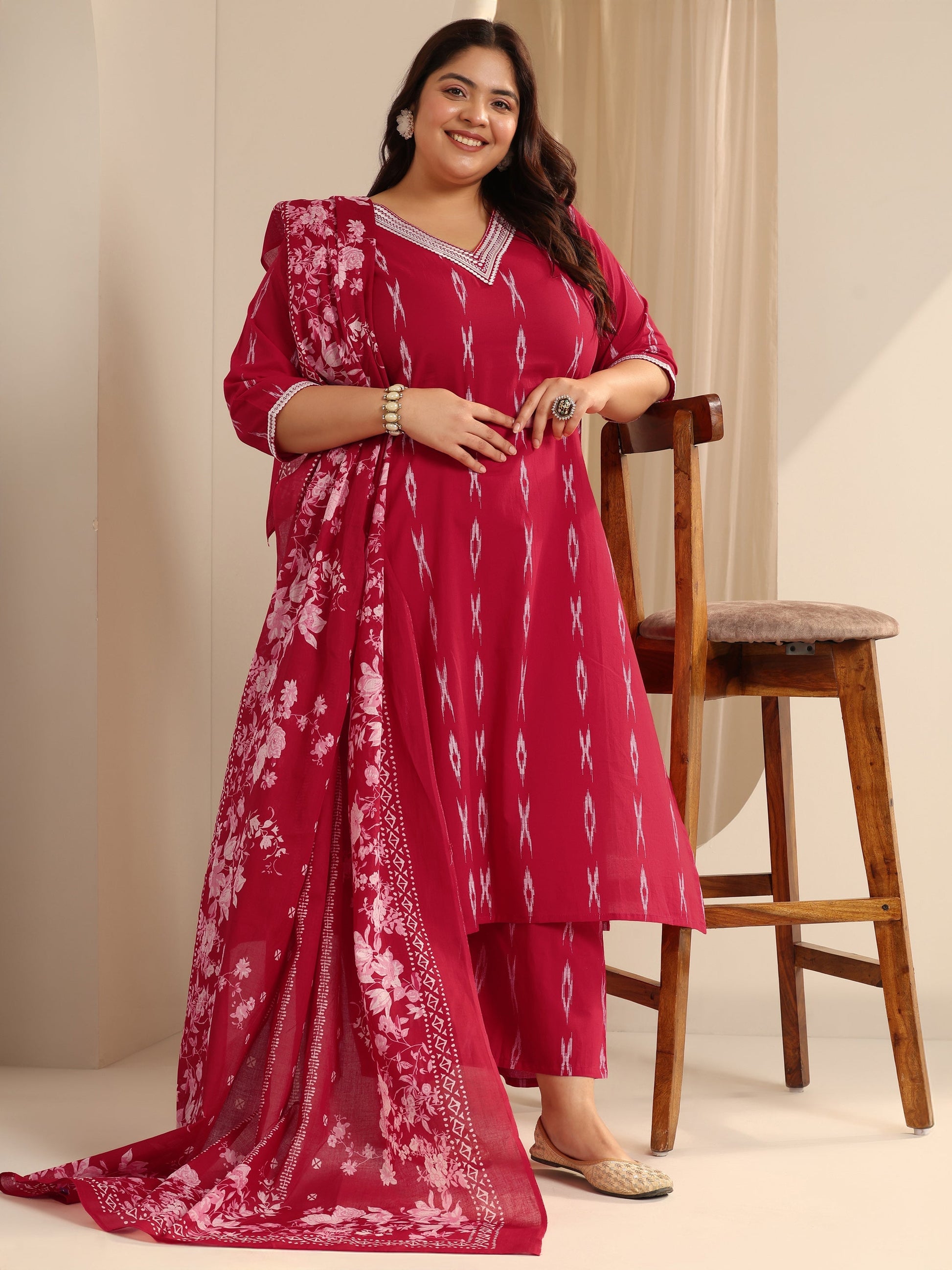 Our 3-piece Red cotton blend Straight-fit kurta set features a V-Neckline, Regular Sleeves, and statement yoke. Complemented with Palazzo Pants with a Partially Elasticated waistband, and a Printed dupatta. Adorned with Floral Printed accents, this style is perfect for Festive wear.