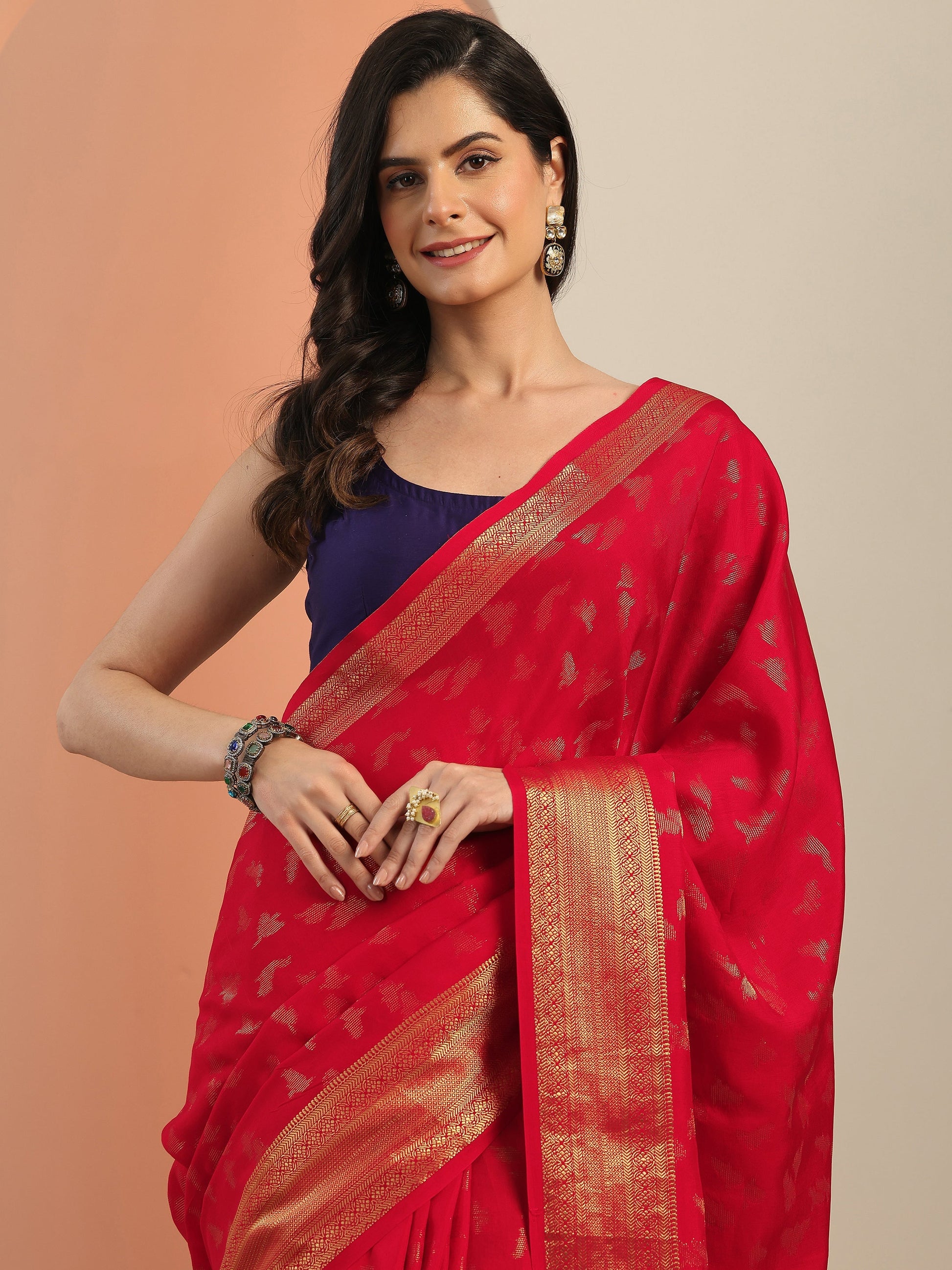 Our Red Woven Design Silk Blend Saree Features Captivating Woven Design. Complemented With A Unstitched Blouse Piece. This Charming Saree Is Perfect For Festive Wear.
