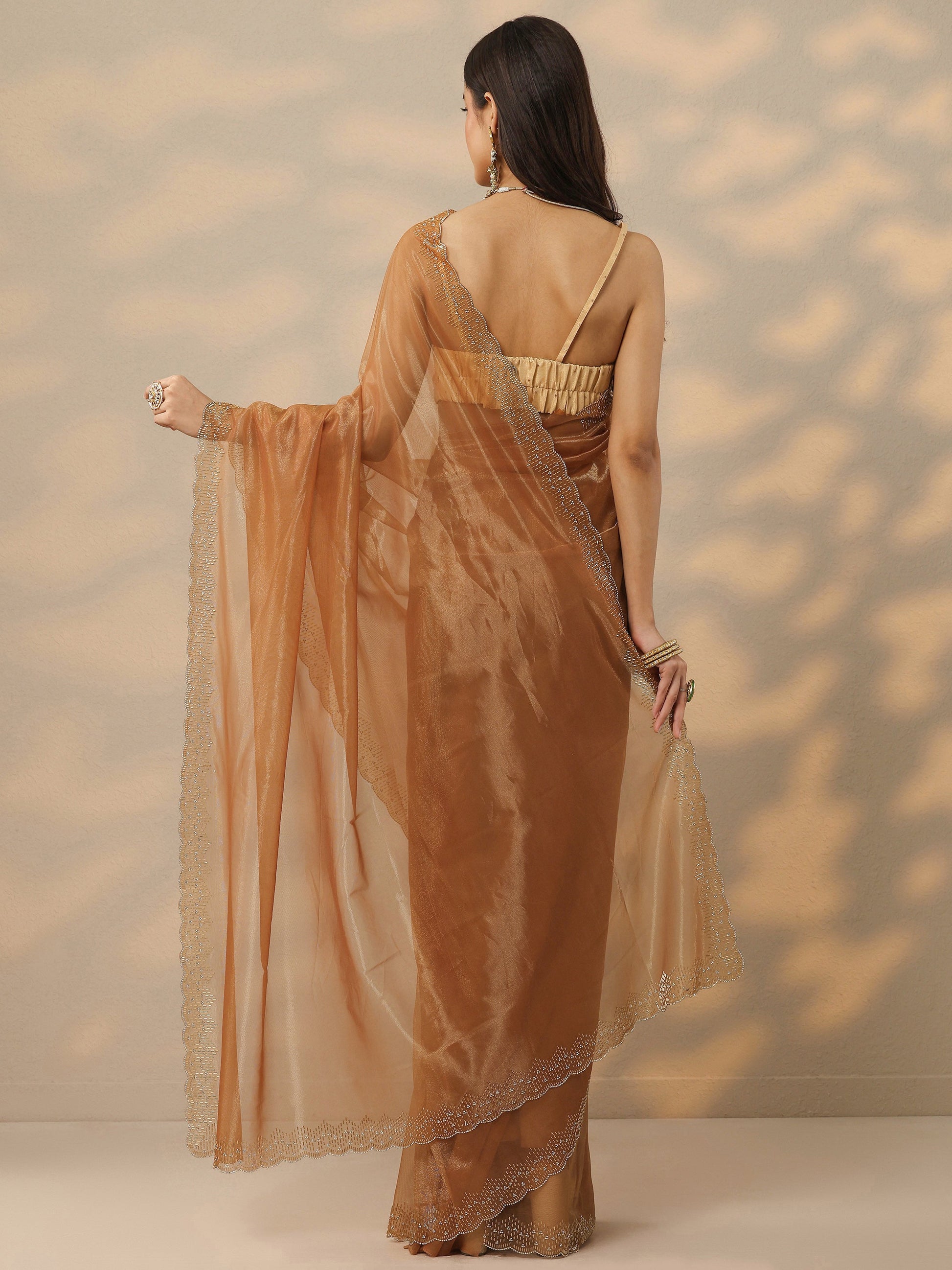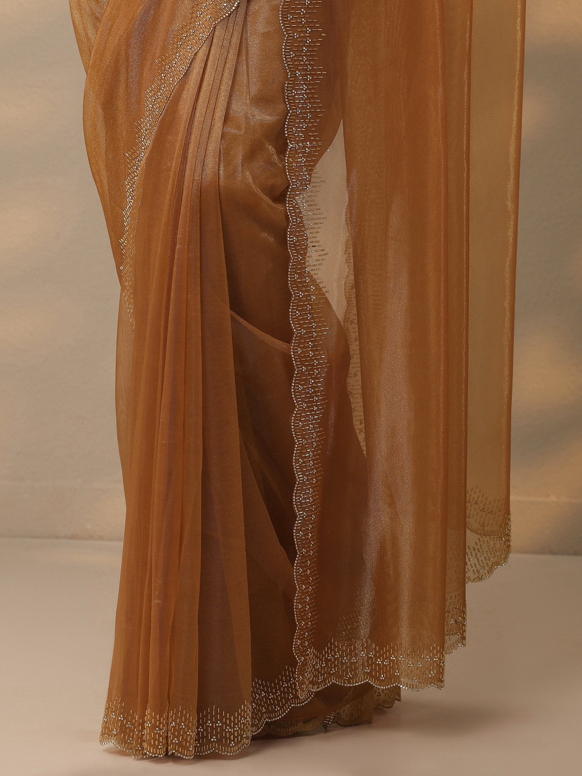 Rust Embellished Nylon Saree With Unstitched Blouse Piece