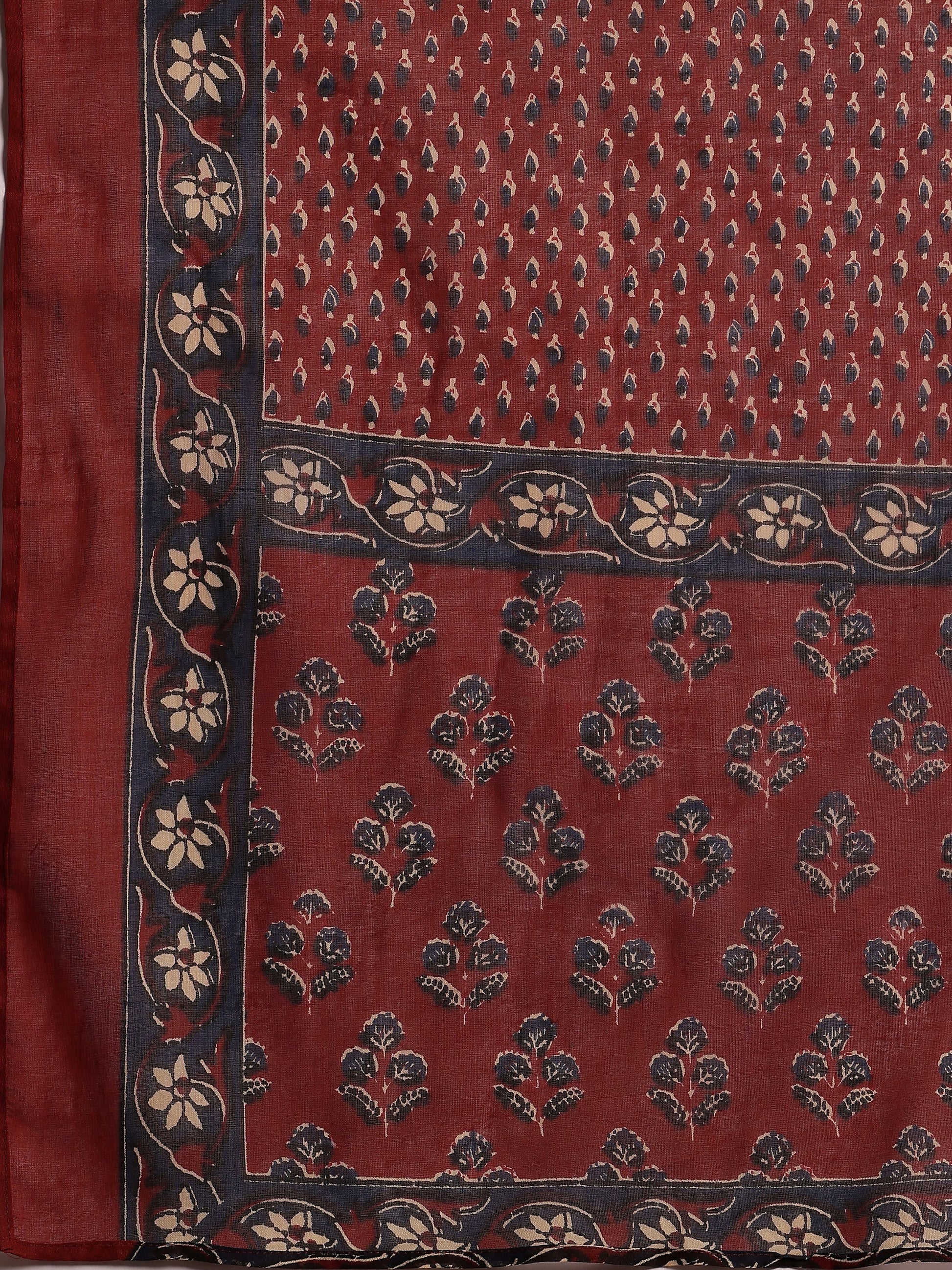 Our 3-piece rust printed cotton suit set features a straight-fit kurta with a notched neckline and three-quarter sleeves. Complemented with palazzo pants with a partially elasticated waistband and roomy pockets, and a dupatta. Highlighted with captivating floral prints and piping-trim accents, this style is perfect for elevated everyday style.