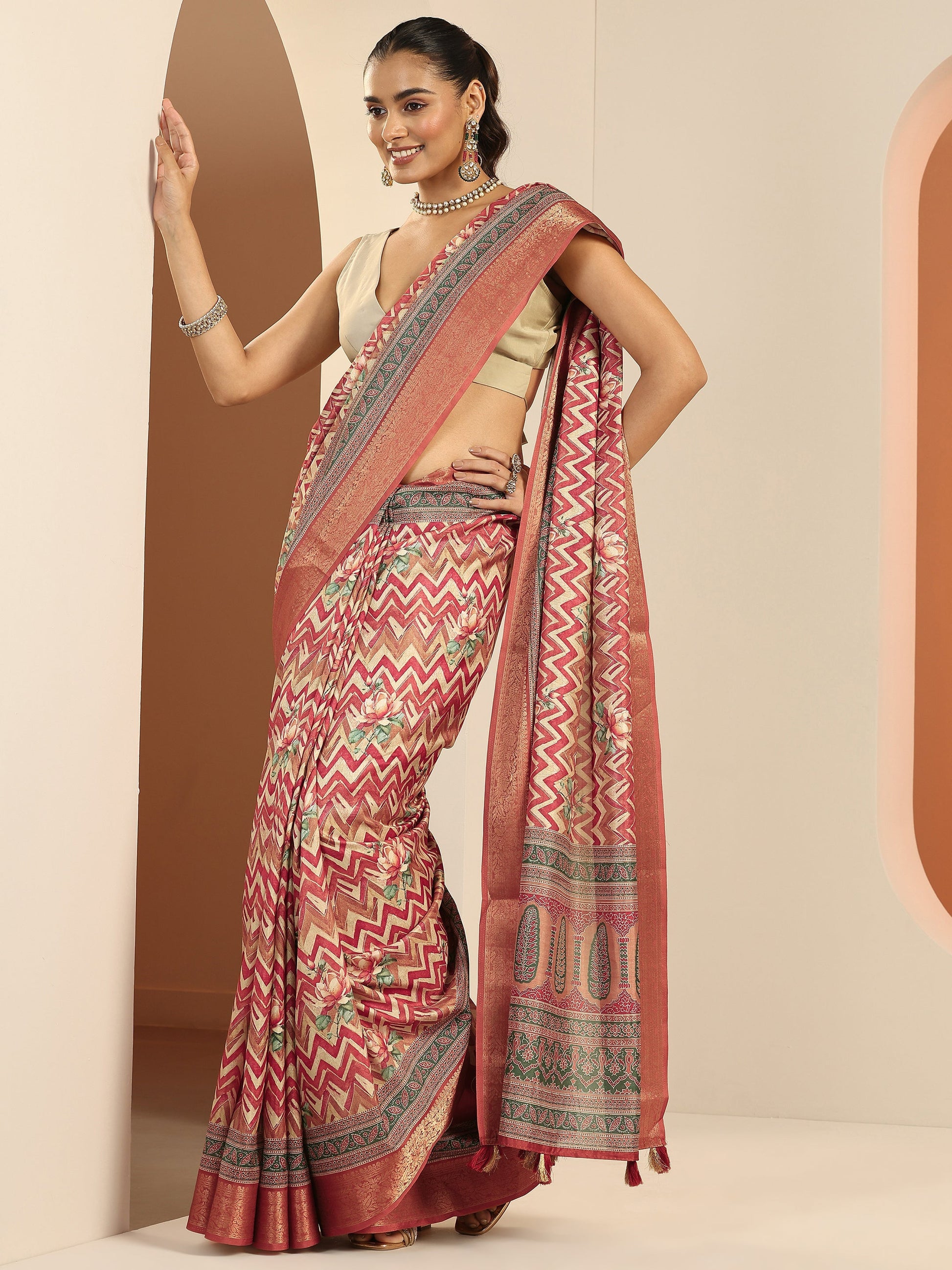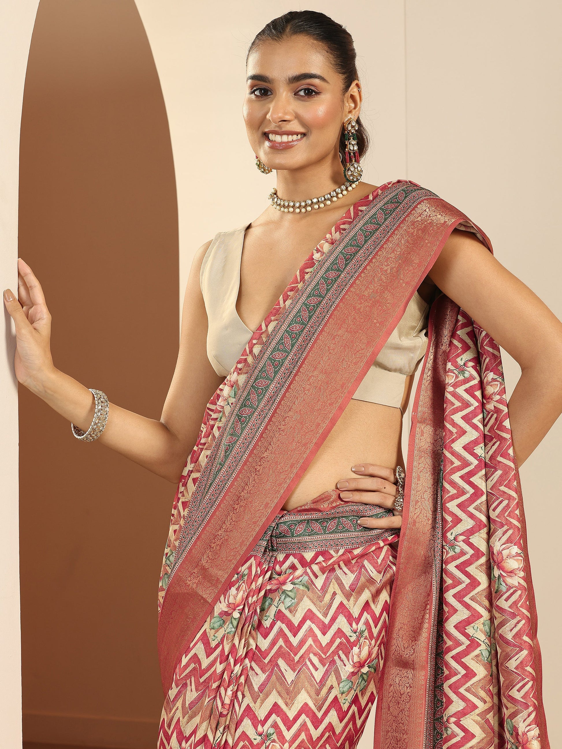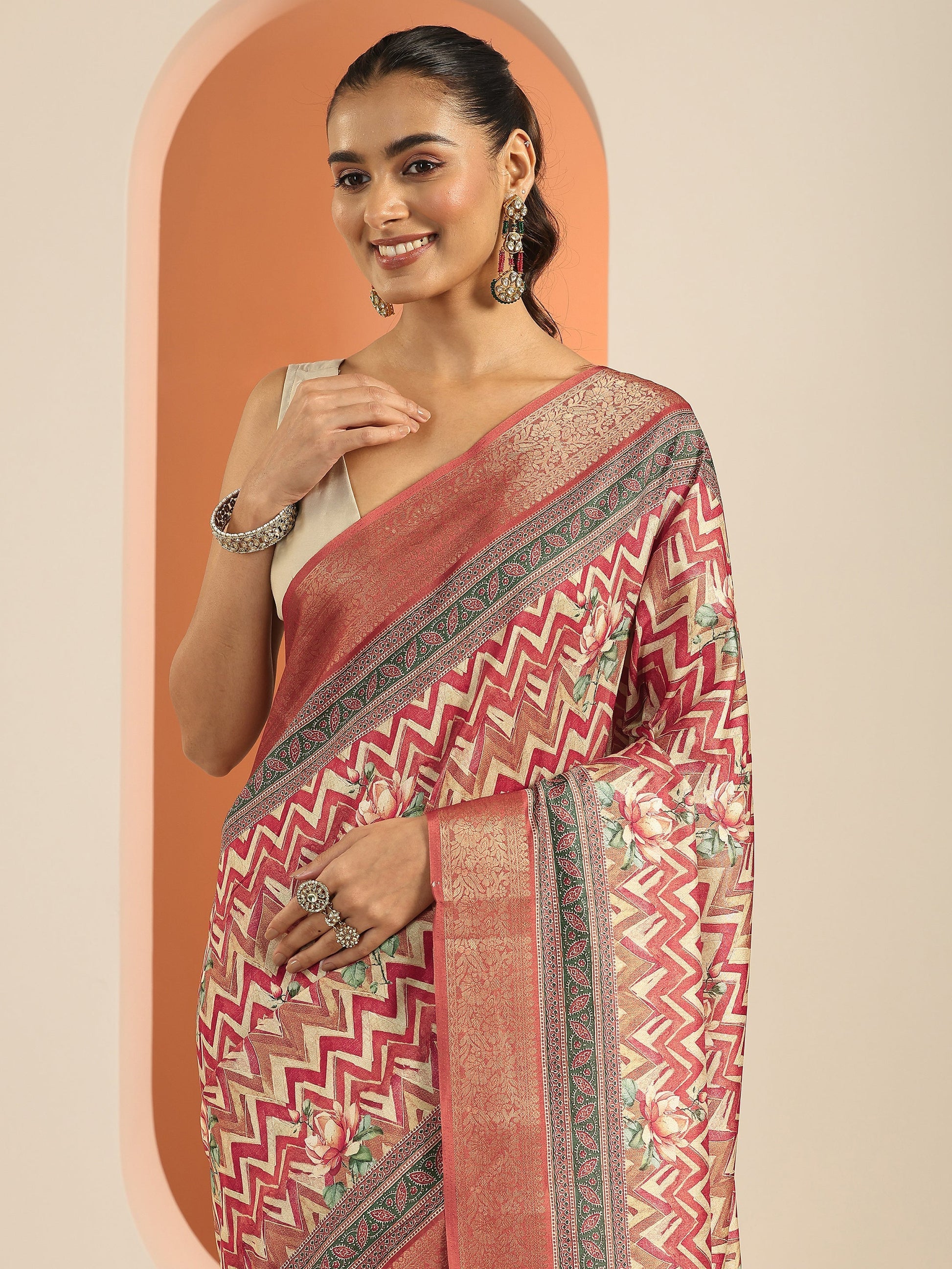 Our Peach Printed Silk Blend Saree Features Captivating Floral Printed Design. Complemented With A Unstitched Blouse Piece. This Charming Saree Is Perfect For Festive Wear.
