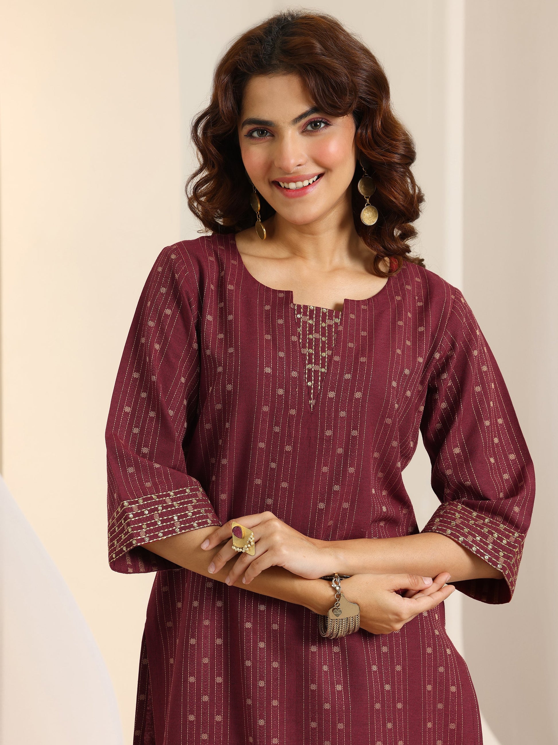 Our 3-piece maroon cotton blend kurta set features a straight-fit kurta with a round neckline, regular sleeves, and a statement yoke. Complemented with straight pants with an elasticated waistband and a dupatta. Adorned with self design and woven design, printed accents, this style is perfect for casual occasions.