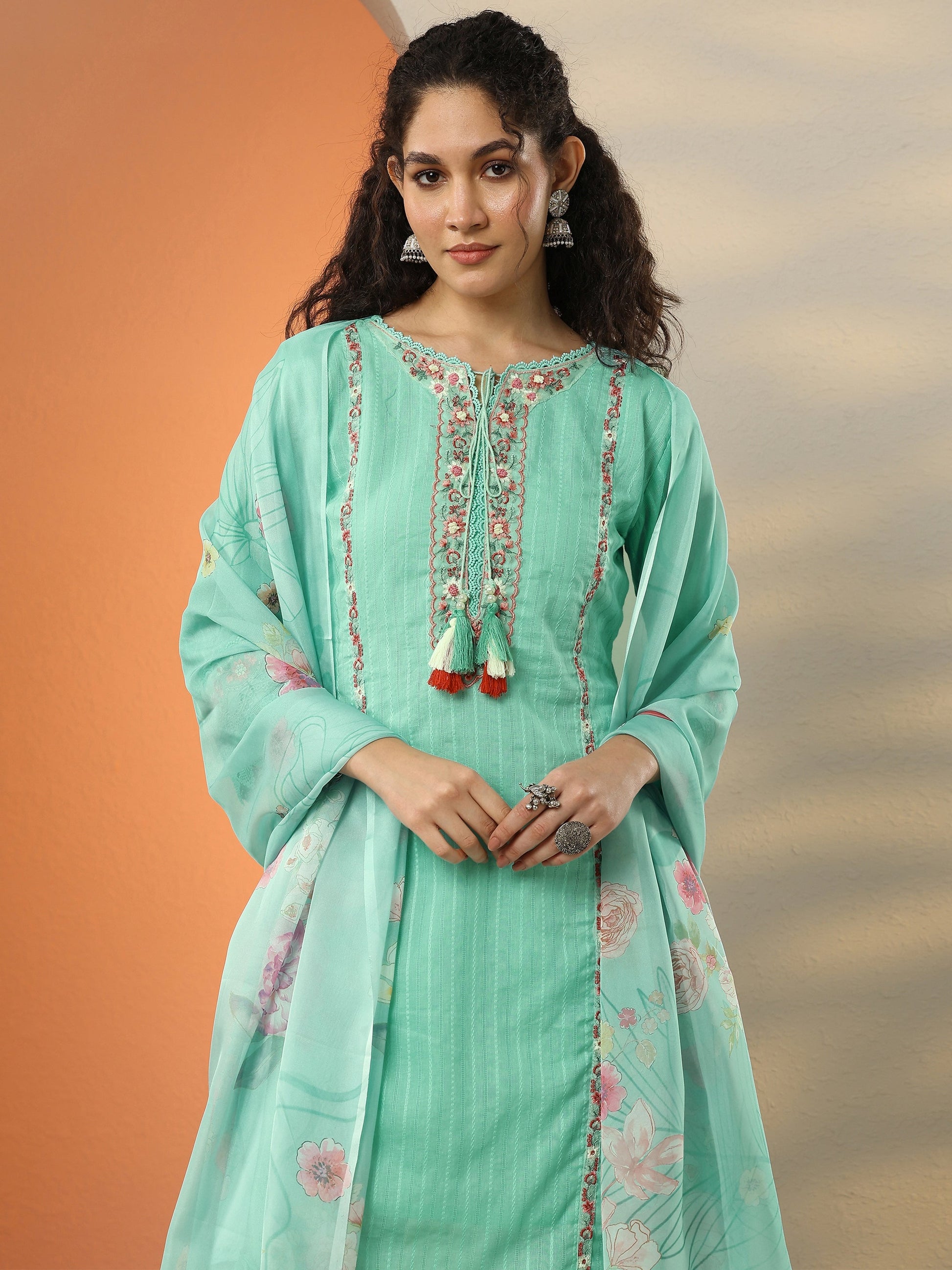 Sea Green Embroidered Cotton Blend A-Line Suit Set With Dupatta