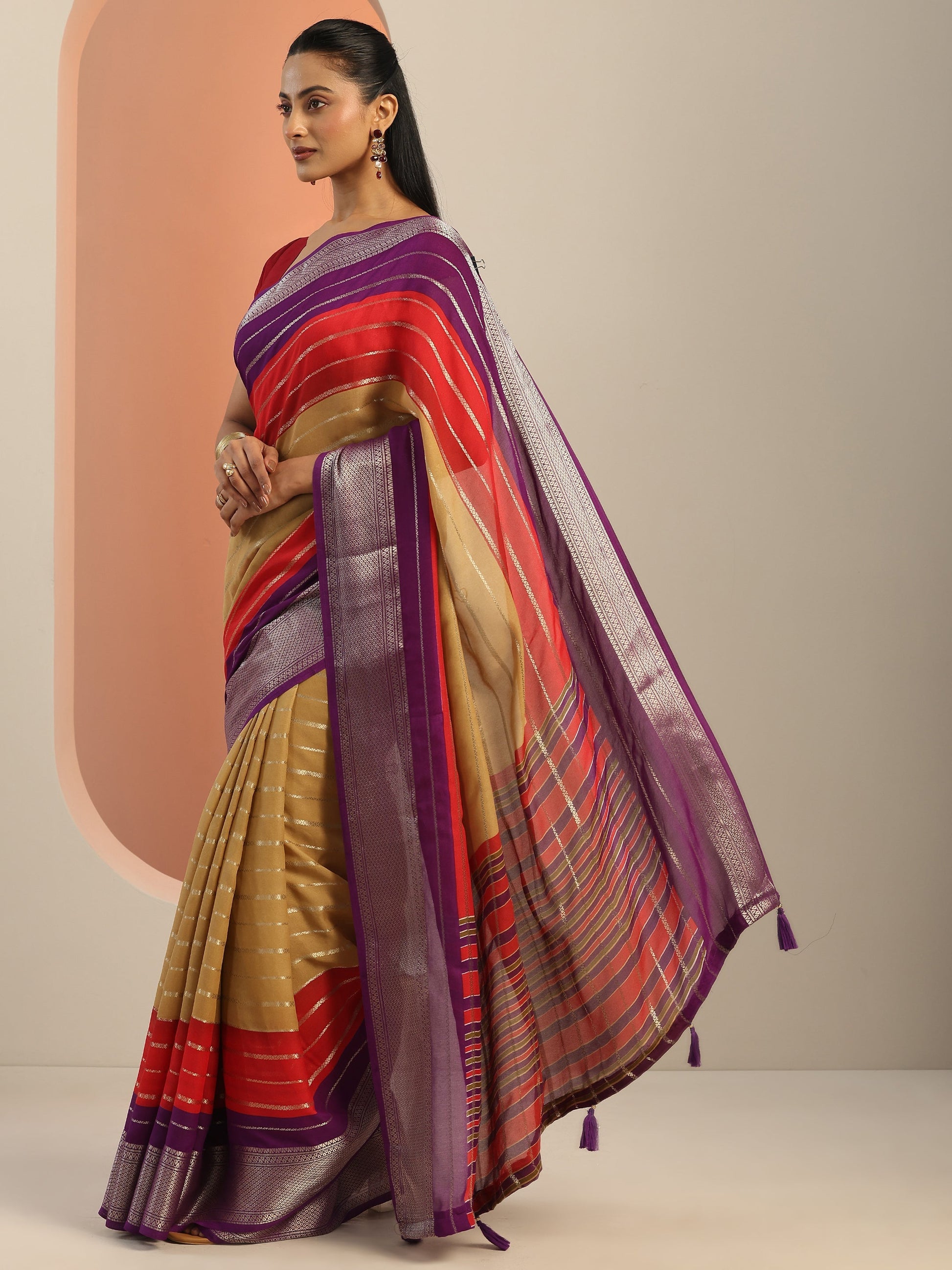 Our Tan Printed Silk Blend Saree Features Captivating Woven Design. Complemented With A Unstitched Blouse Piece. This Charming Saree Is Perfect For Festive Wear.