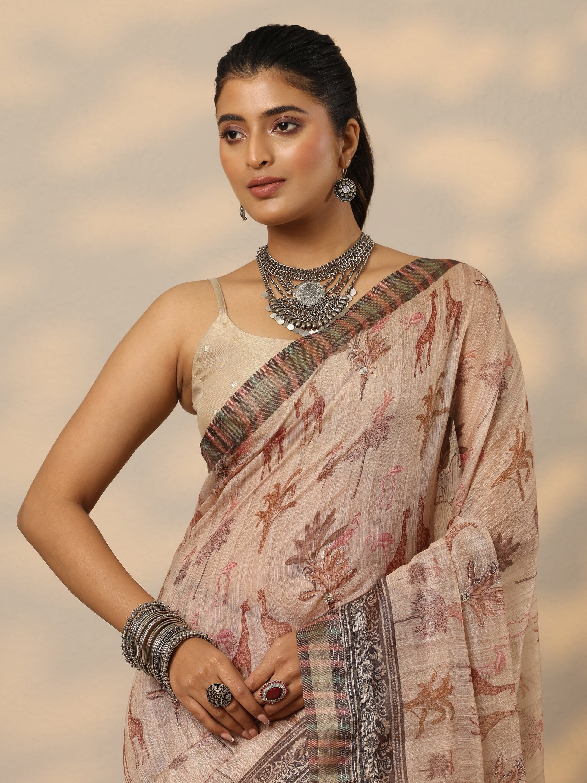 Our beige printed cotton blend saree features captivating animal and floral prints. Complemented with a blouse piece. This charming saree is perfect for festive occasions.