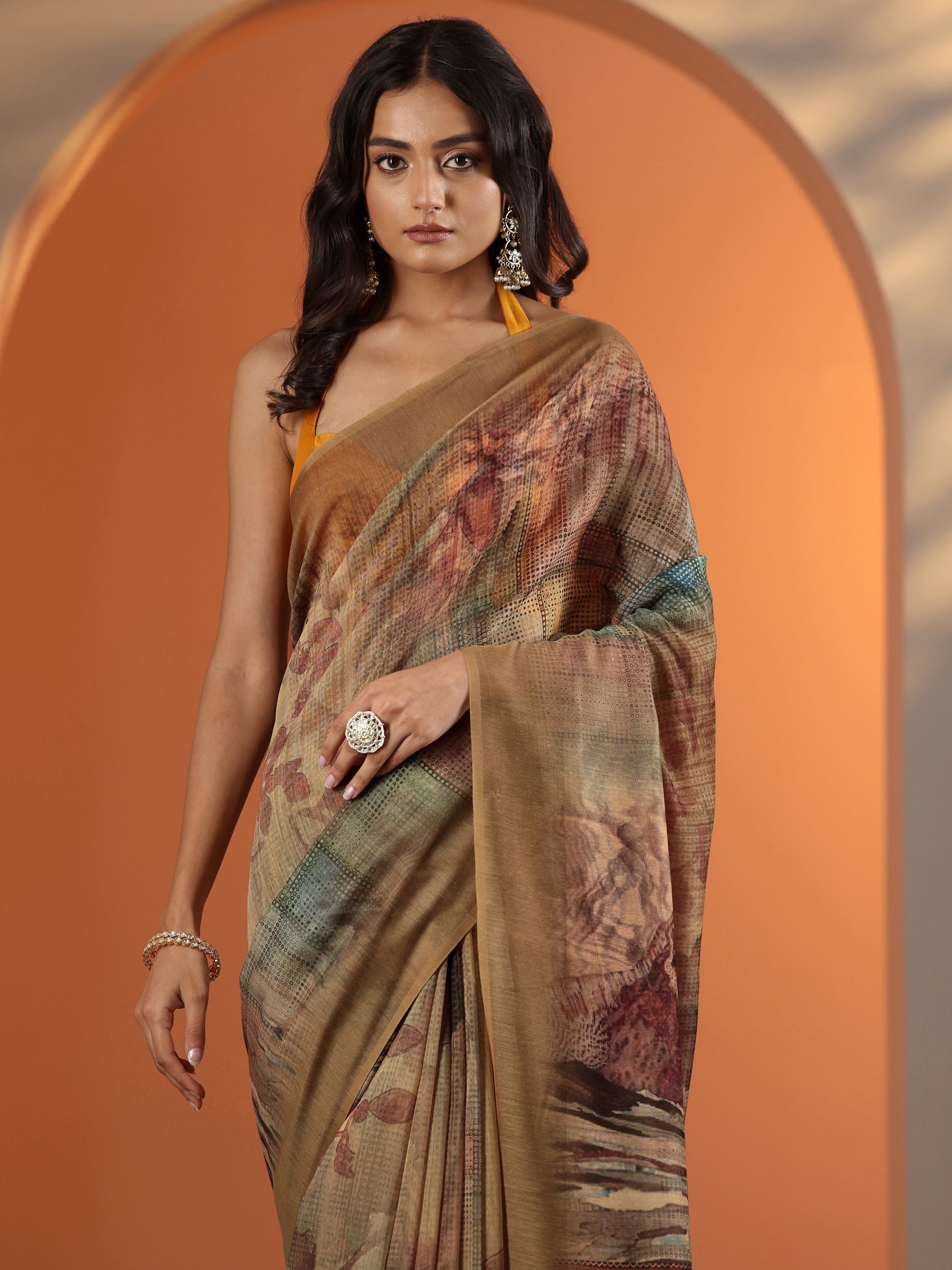 Tan Printed Silk Blend Saree With Unstitched Blouse Piece