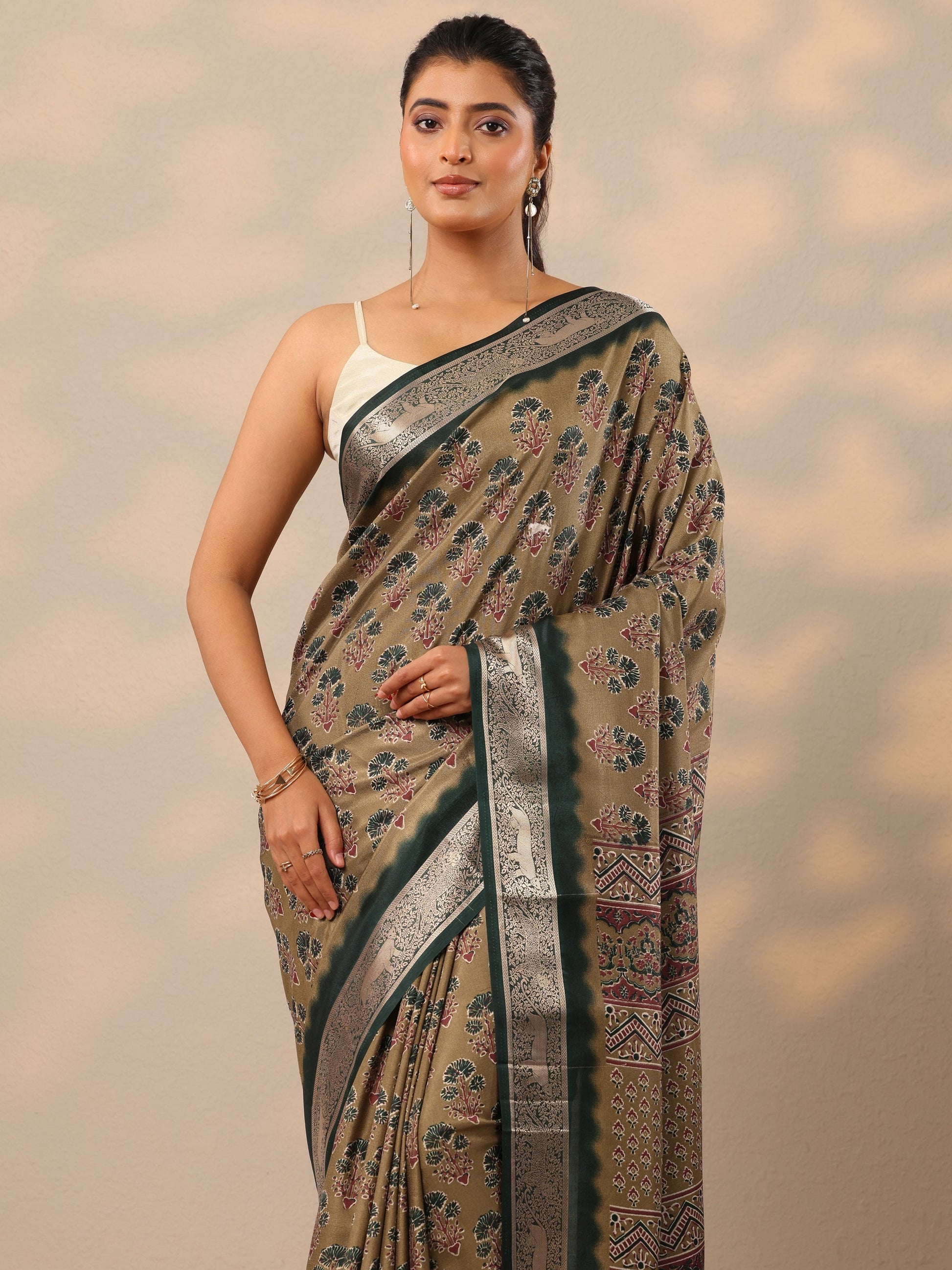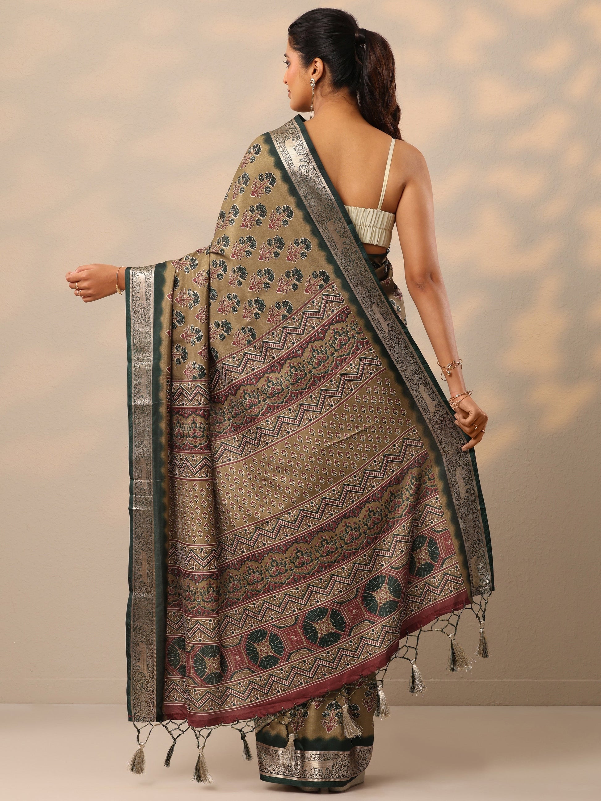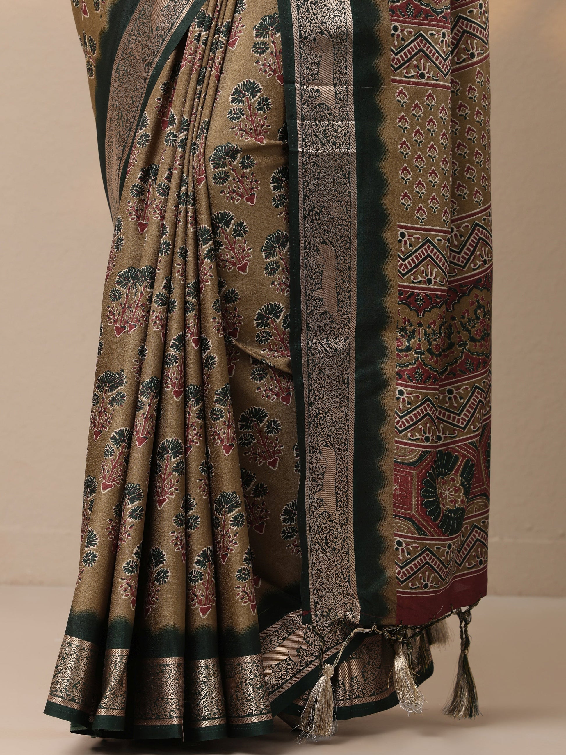 Tan Printed Silk Blend Sarees With Unstitched Blouse Piece