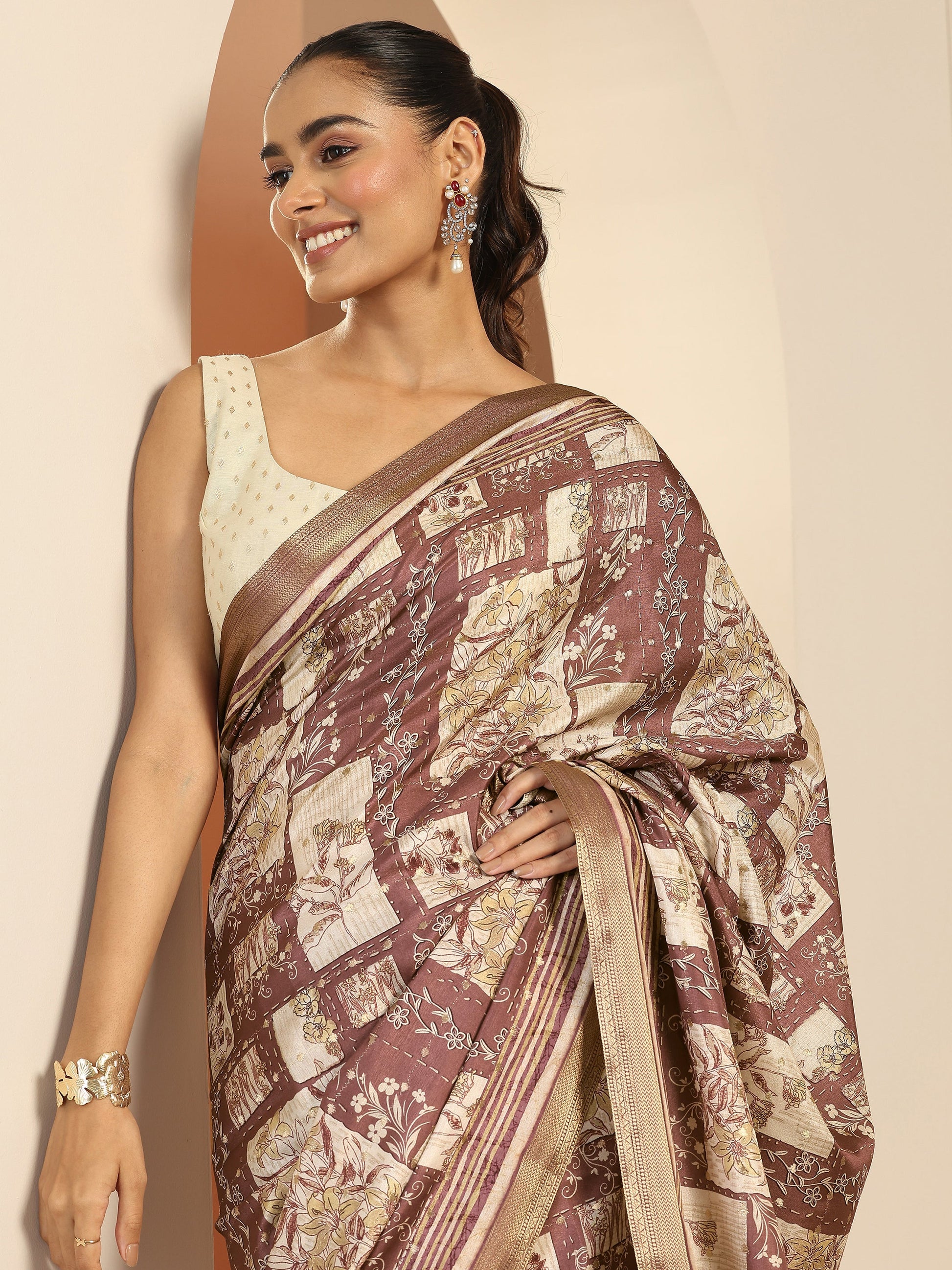 Taupe Printed Silk Blend Saree With Unstitched Blouse Piece