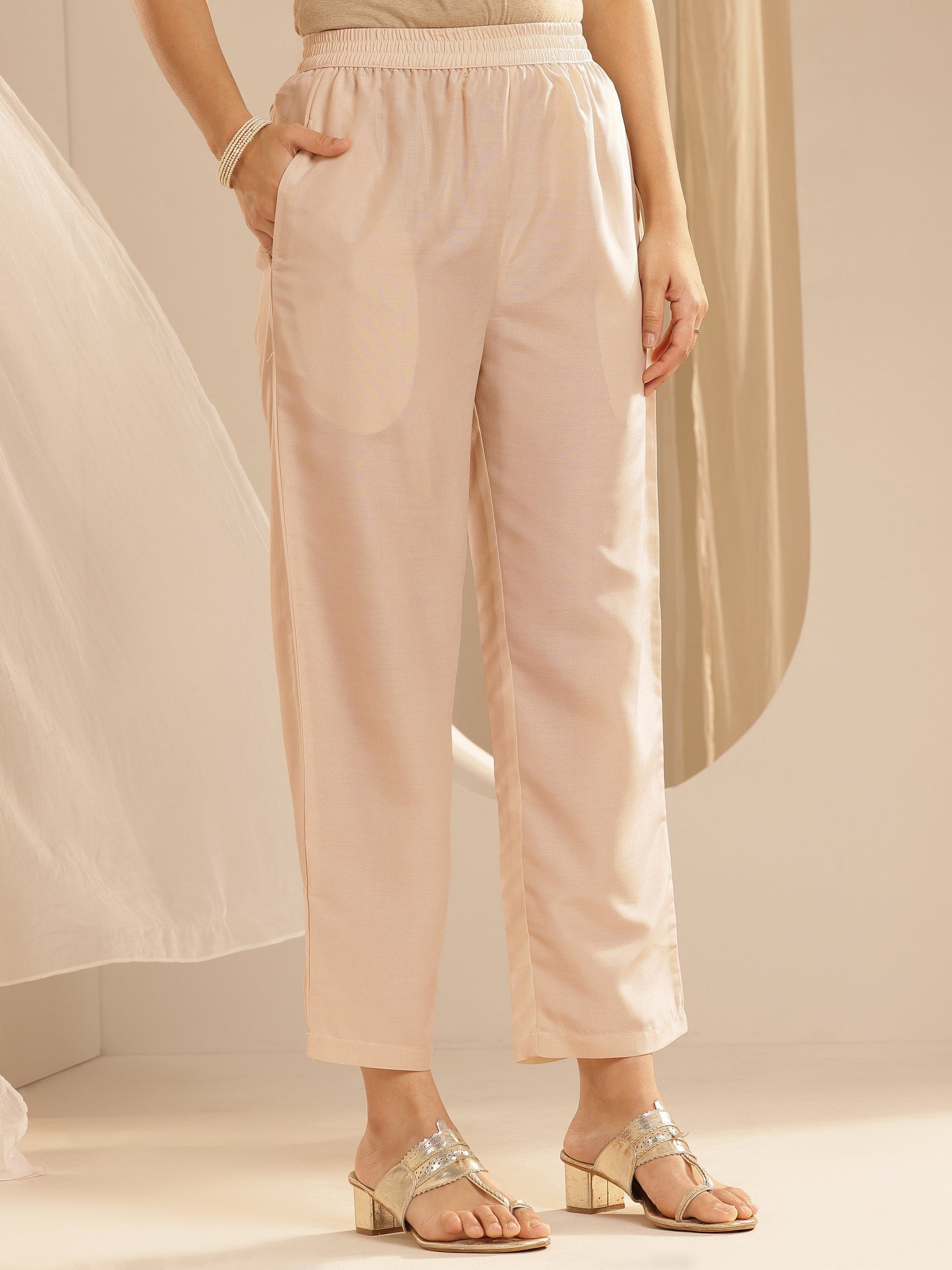 Our 3-piece peach silk blend straight-fit kurta set features a round neckline, regular sleeves, and a statement yoke. Complemented with straight pants with an elasticated waistband and 1 pocket, and an embroidered dupatta. Adorned with embroidered, solid accents, this style is perfect for festive occasions.