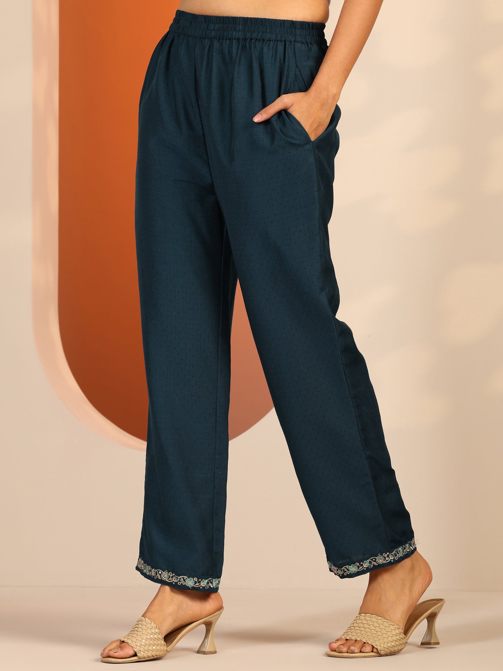 Teal Embroidered Silk Blend Straight Suit Set With Dupatta
