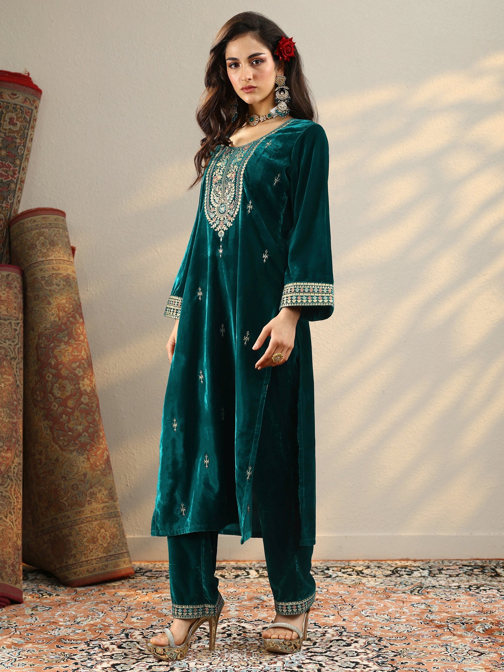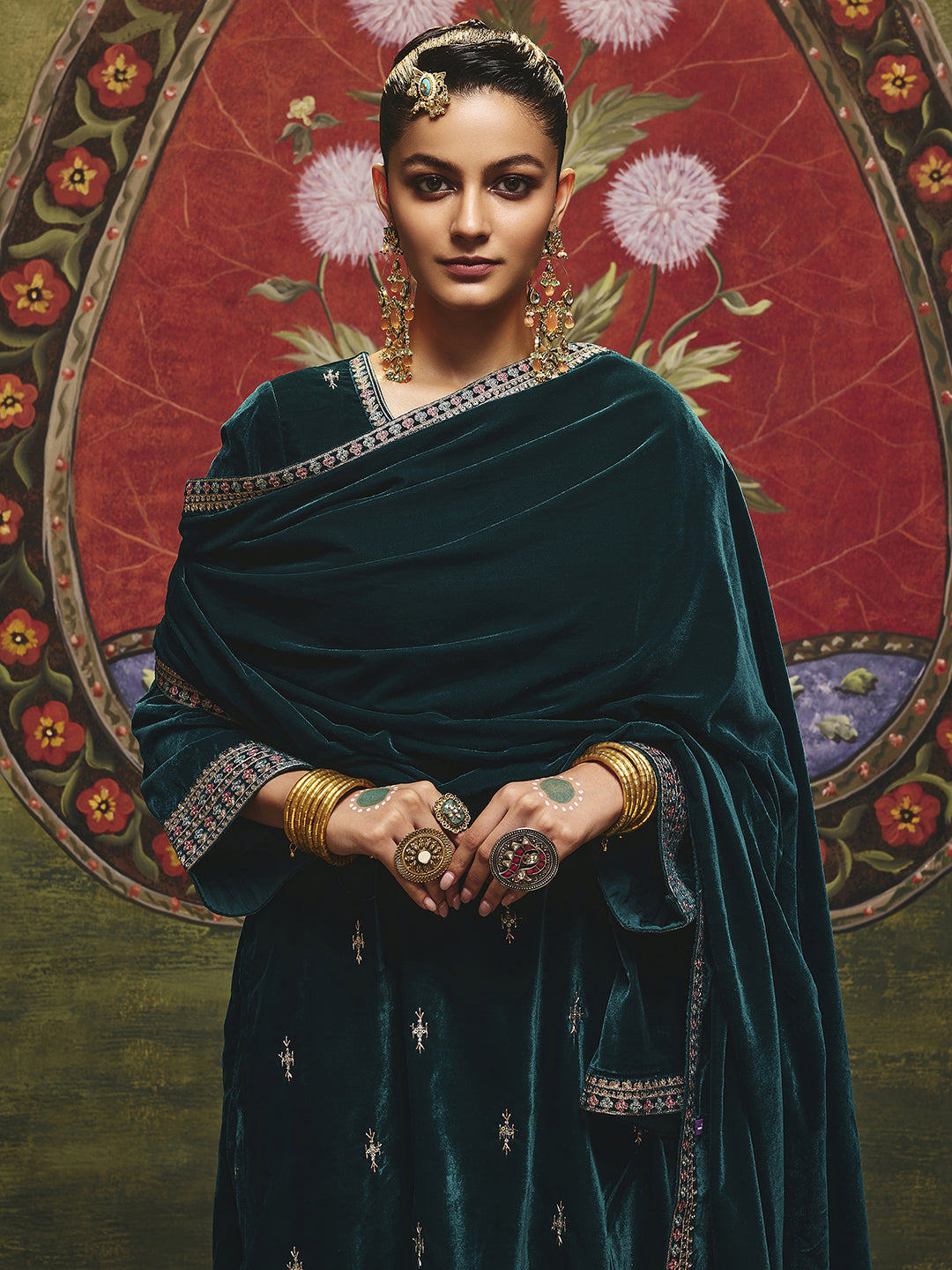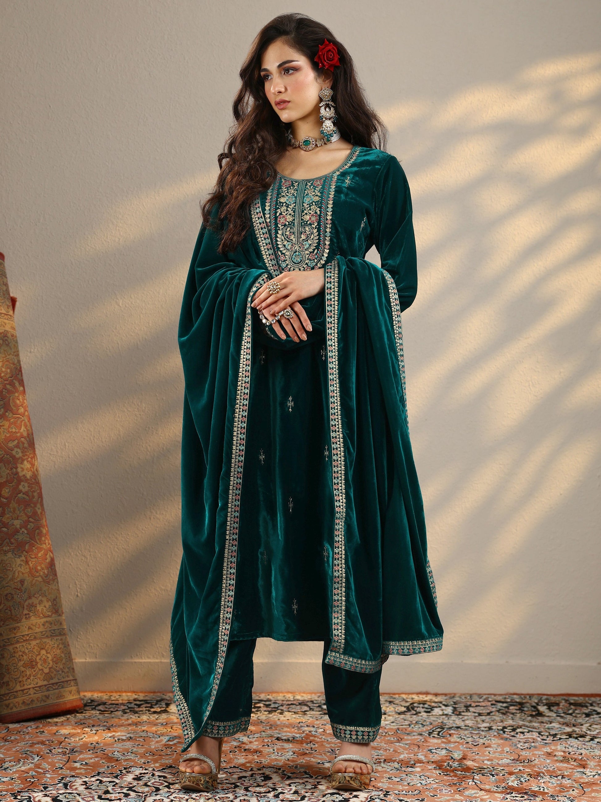 Amruta Teal Embroidered Velvet Straight Suit Set With Dupatta