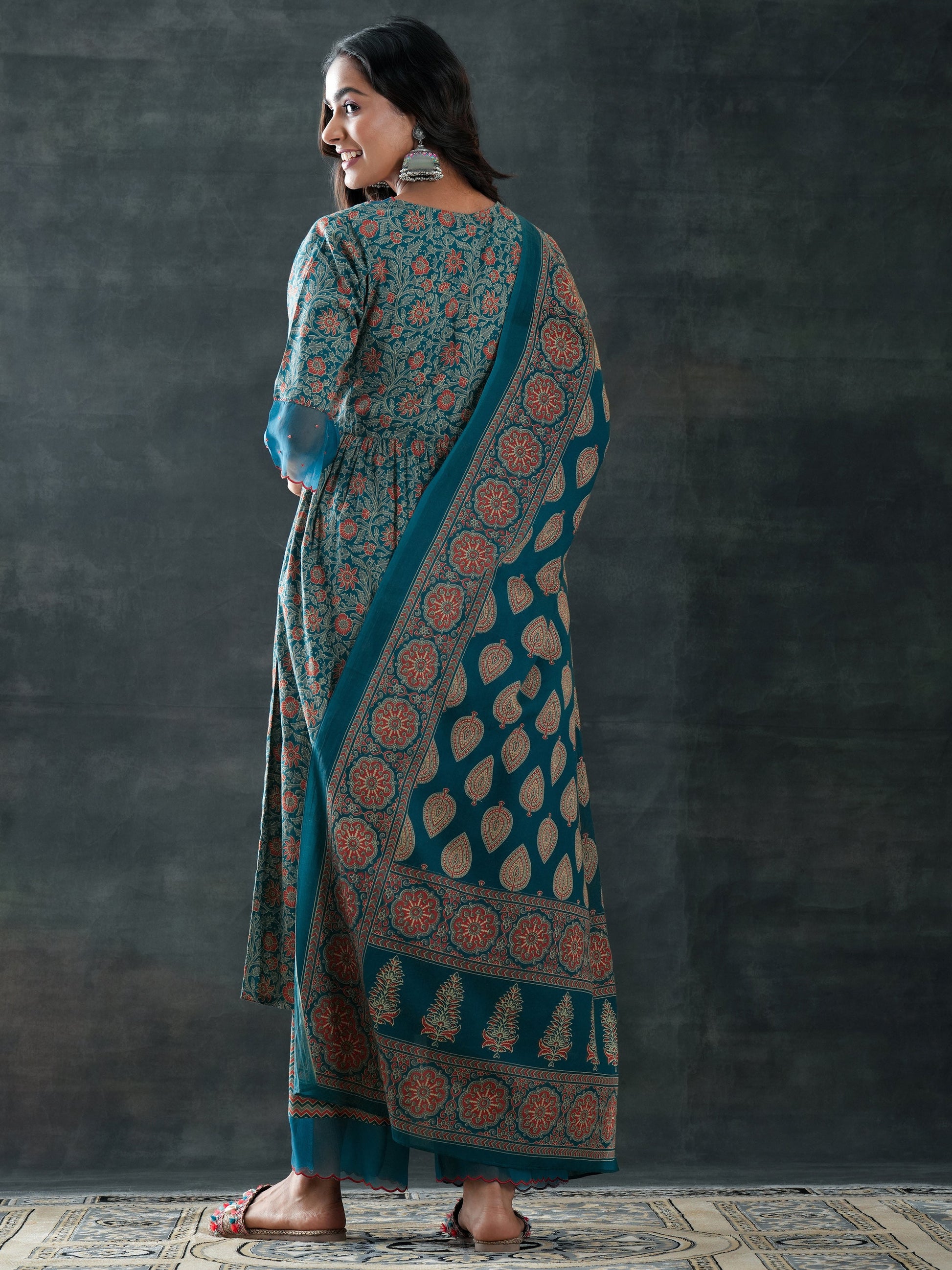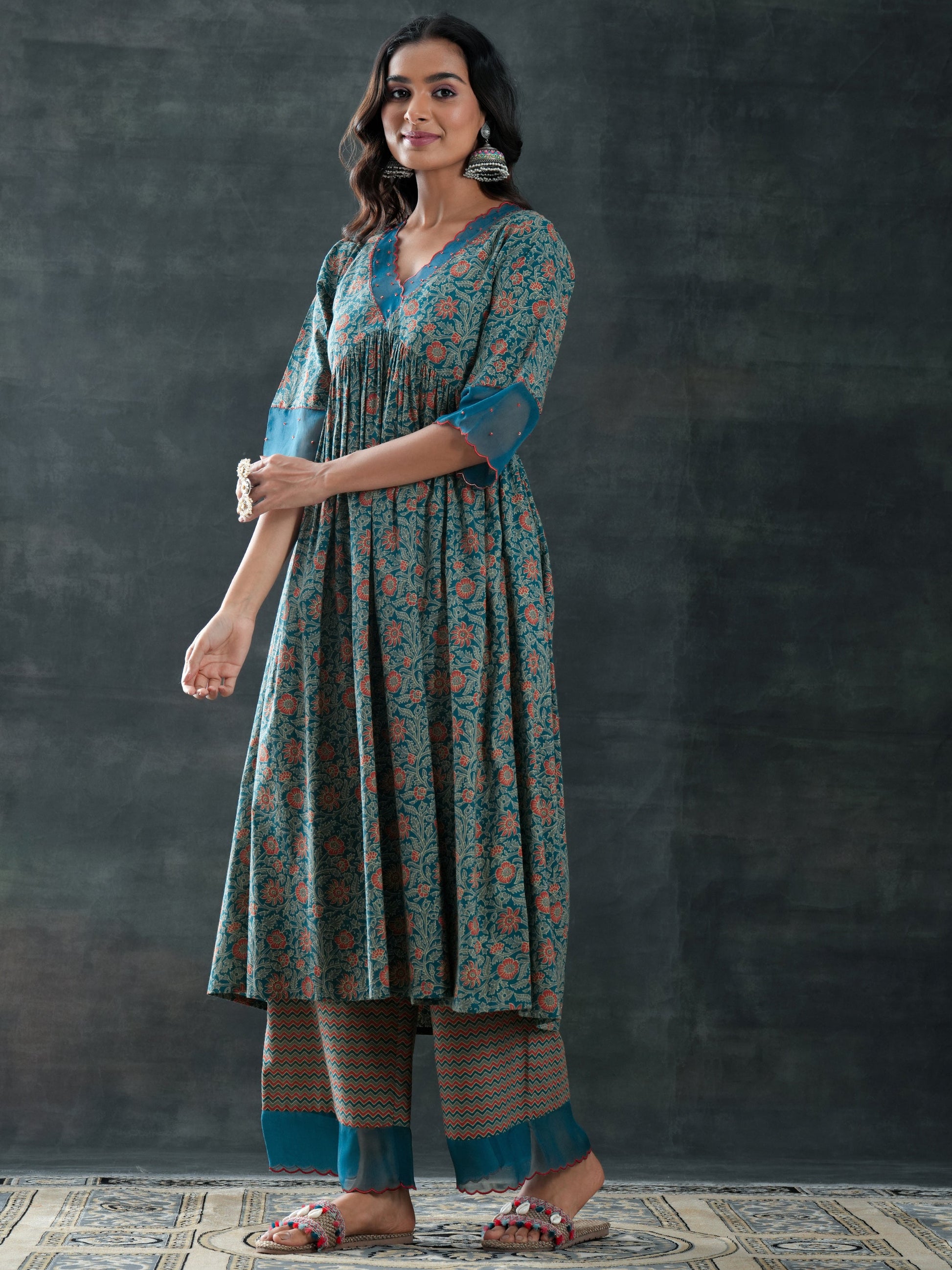 Teal Printed Cotton Anarkali Suit Set With Dupatta