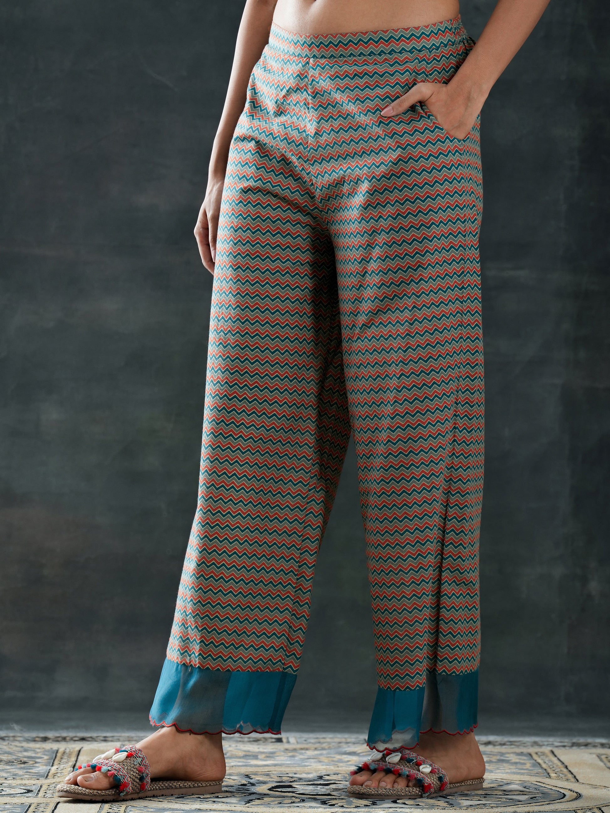 Our 3-piece teal multi cotton Anarkali kurta set features a V-neckline, regular sleeves, and statement yoke. Complemented with palazzo pants with a partially elasticated waistband and 2 pockets, and a printed dupatta. Adorned with floral prints, this style is perfect for casual wear.
