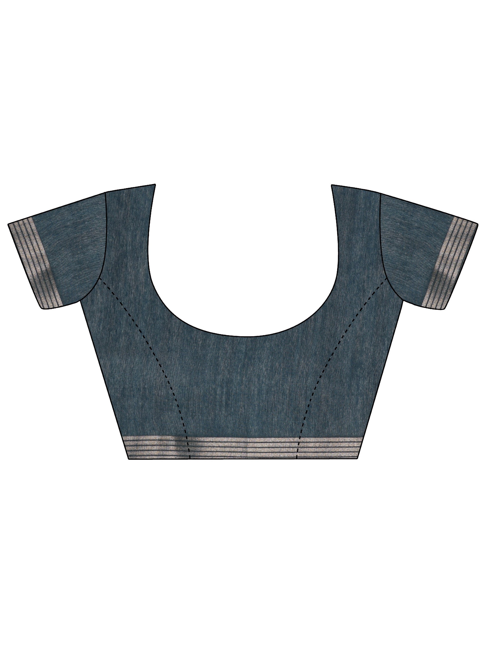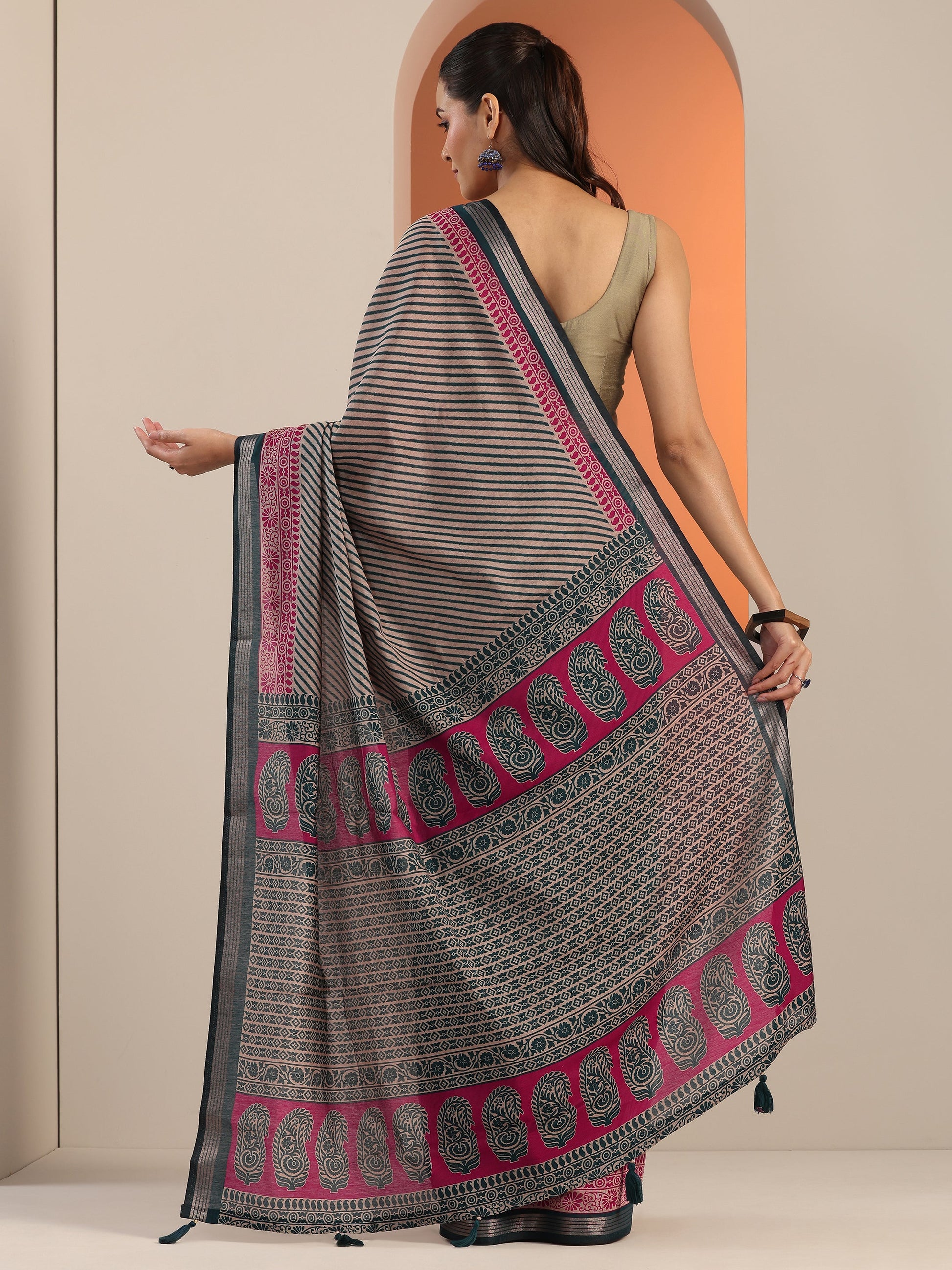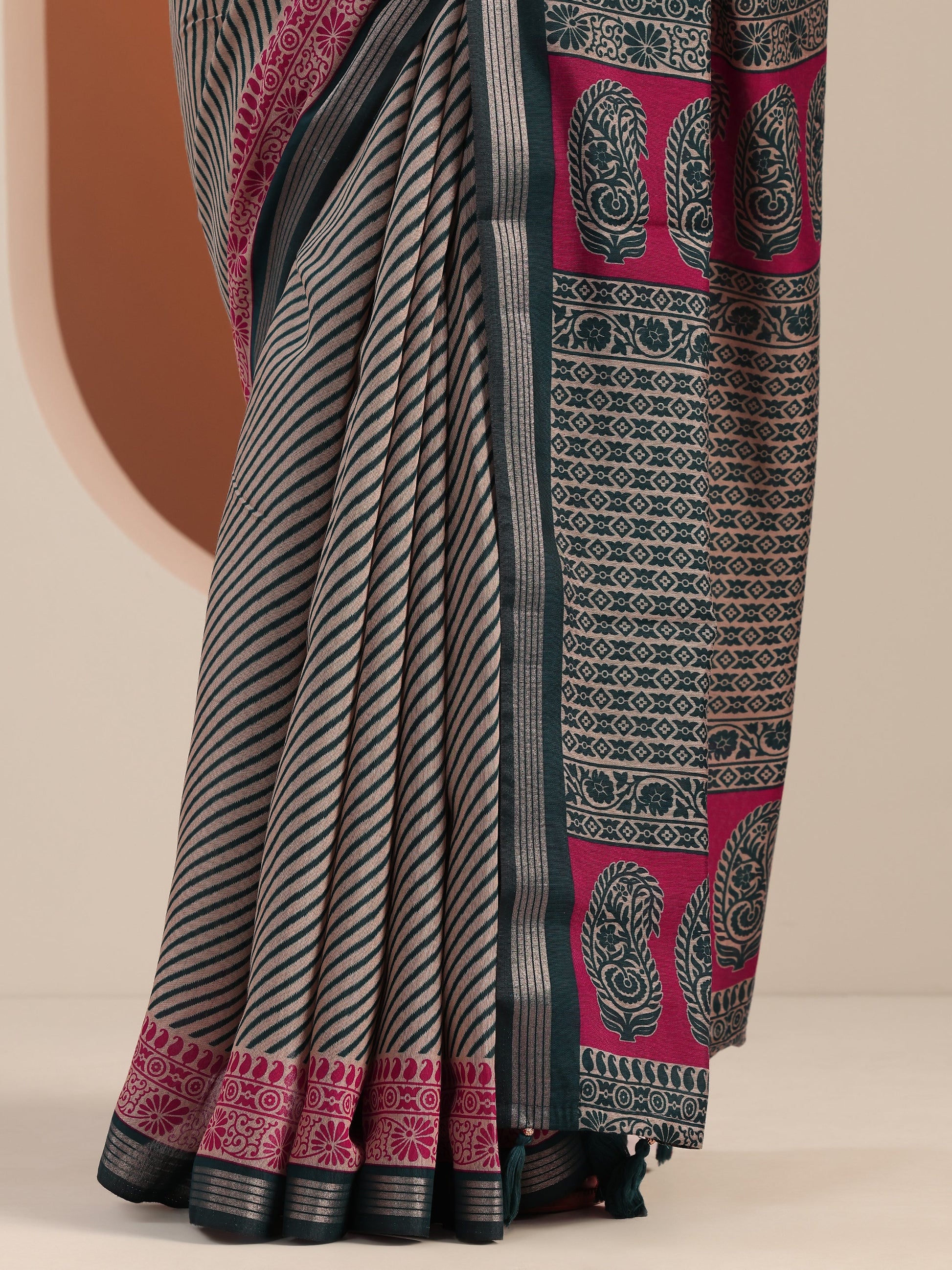 Teal Printed Cotton Blend Saree With Unstitched Blouse Piece
