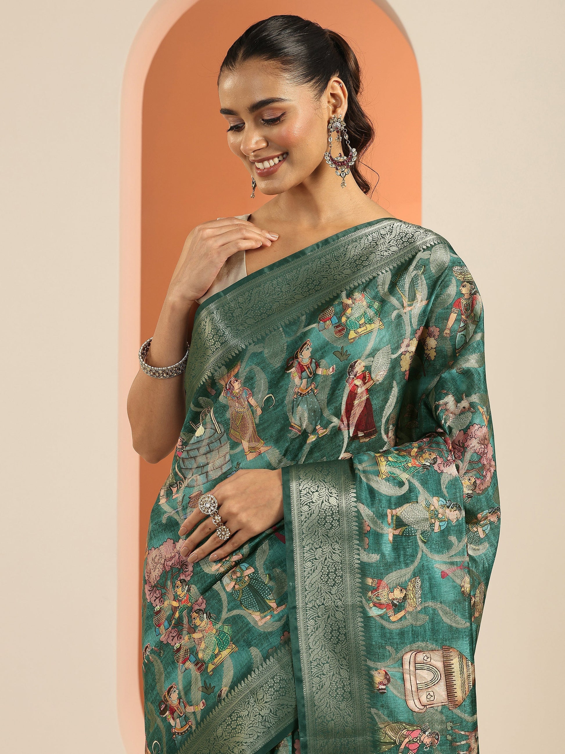 Our Teal Printed Silk Blend Saree Features Captivating Tribal Printed Design. Complemented With A Unstitched Blouse Piece. This Charming Saree Is Perfect For Festive Wear.