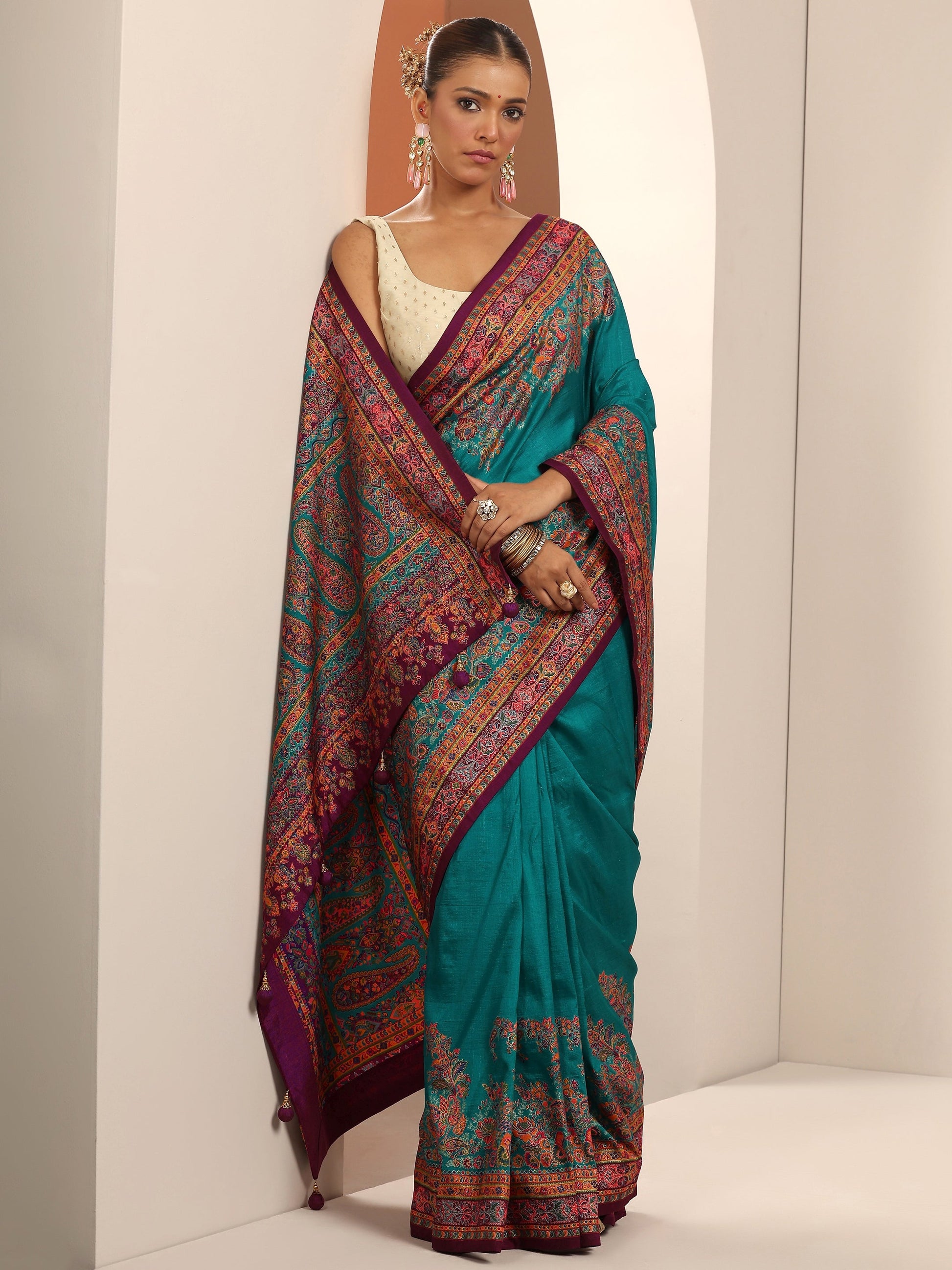 Teal Printed Silk Blend Saree With Unstitched Blouse Piece