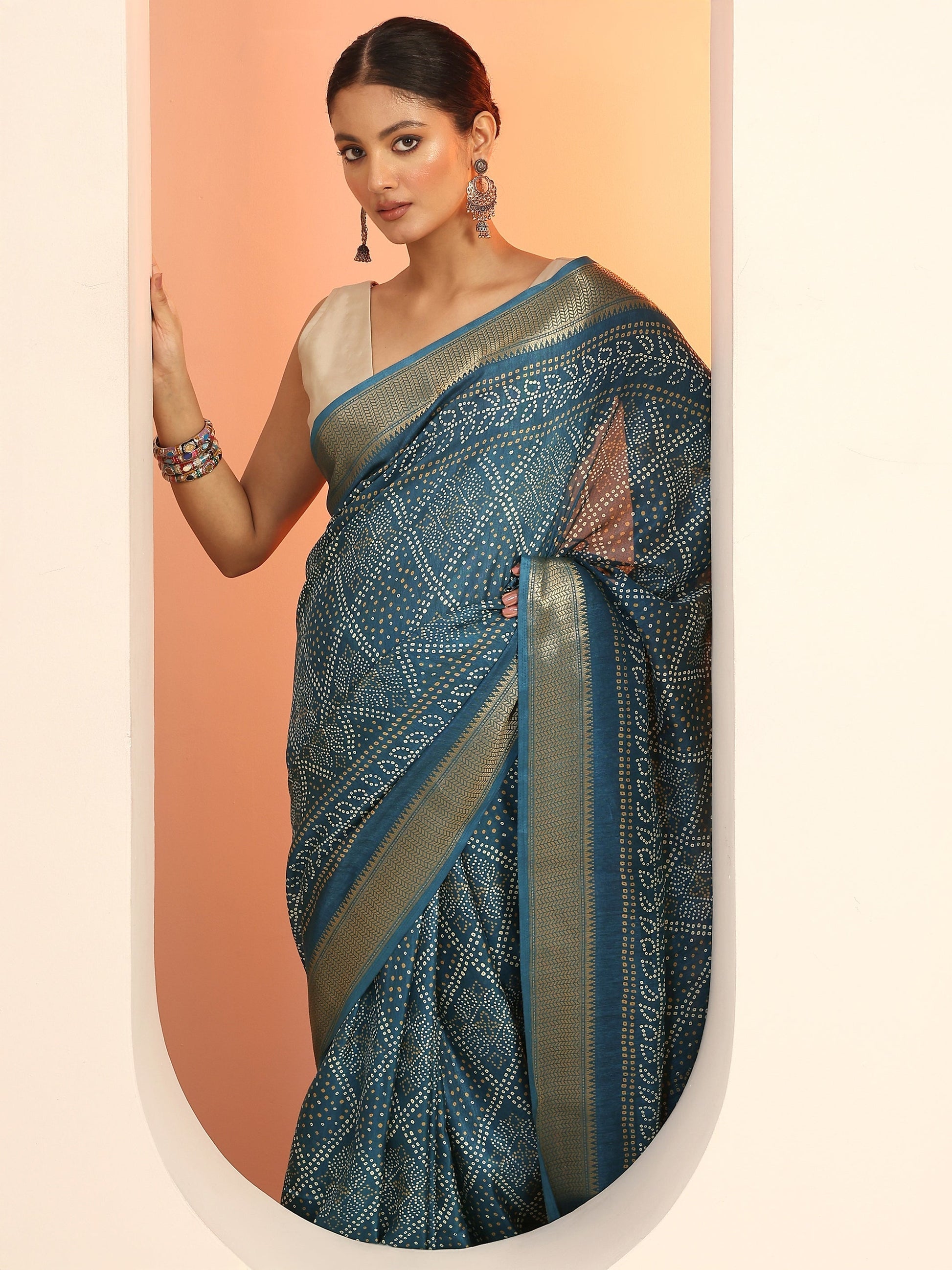 Our Teal Printed Silk Blend Saree Features Captivating Bandhani Printed Design. Complemented With An Unstitched Blouse Piece. This Charming Saree Is Perfect For Festive Wear