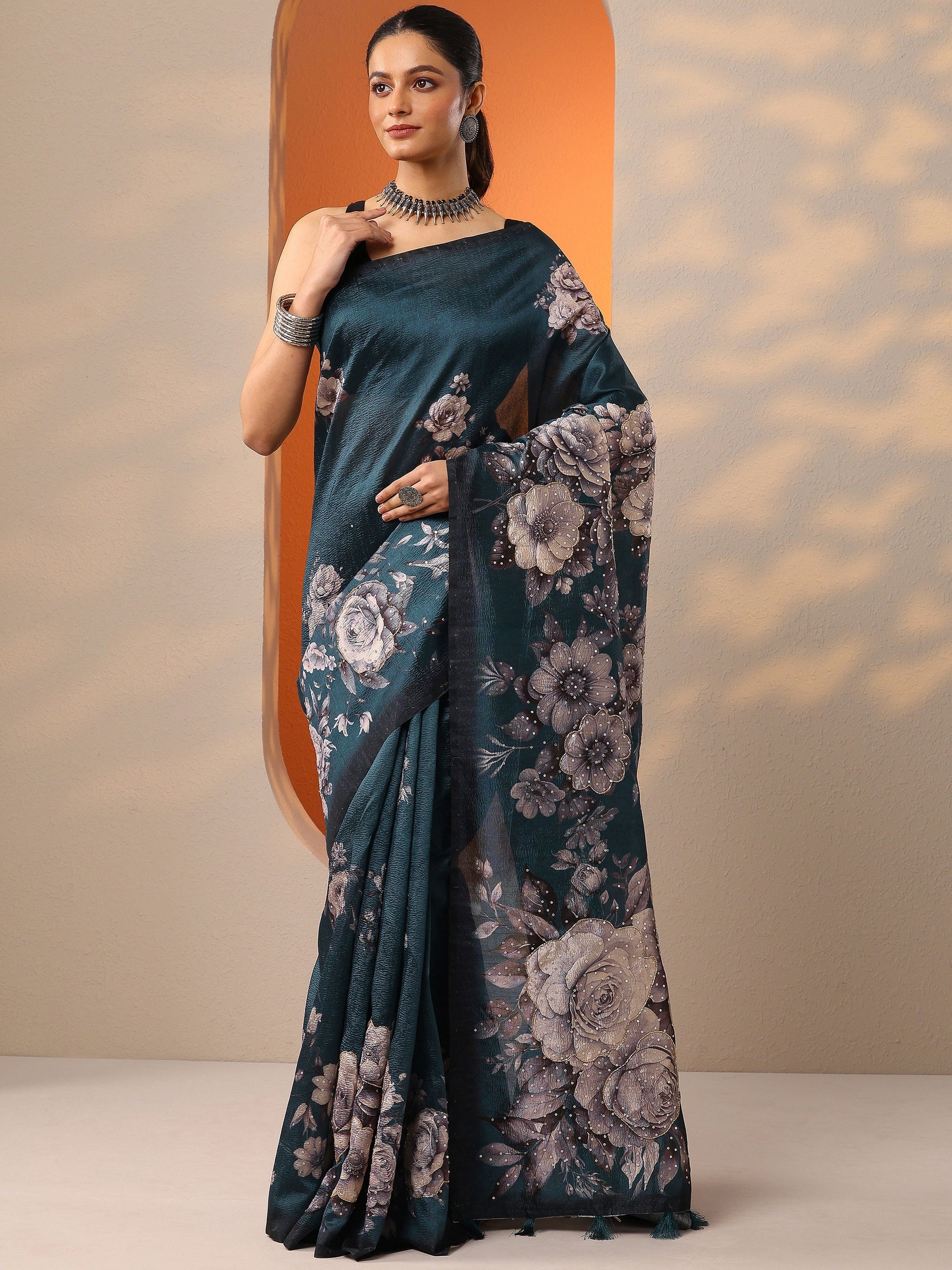 Teal Printed Silk Blend Saree With Unstitched Blouse Piece