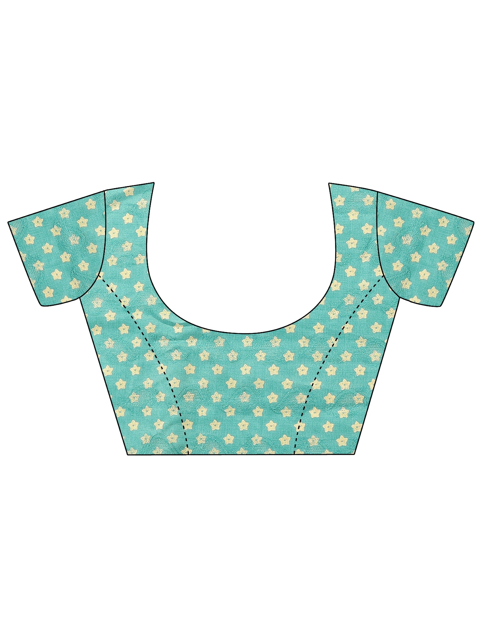 Our teal printed silk blend saree features captivating intricate patterns. Complemented with a blouse piece. This charming saree is perfect for festive occasions.