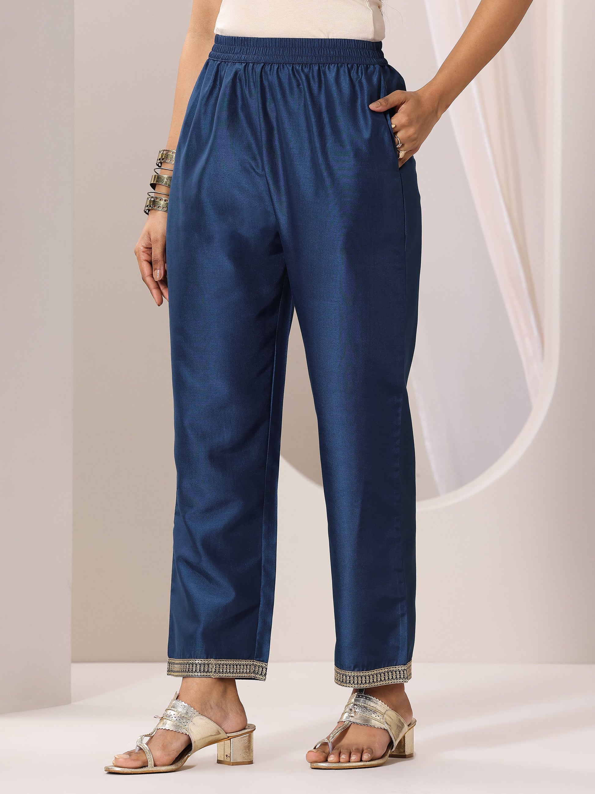 Our 3-piece teal printed silk chiffon straight suit set features a straight-fit kurta with a notched neckline, three-quarter sleeves, and a statement yoke. Complemented with solid trousers with an elasticated waistband and roomy pockets, and a printed dupatta. Highlighted with floral prints, sequins accents, and thread work, this style is perfect for light festivities.