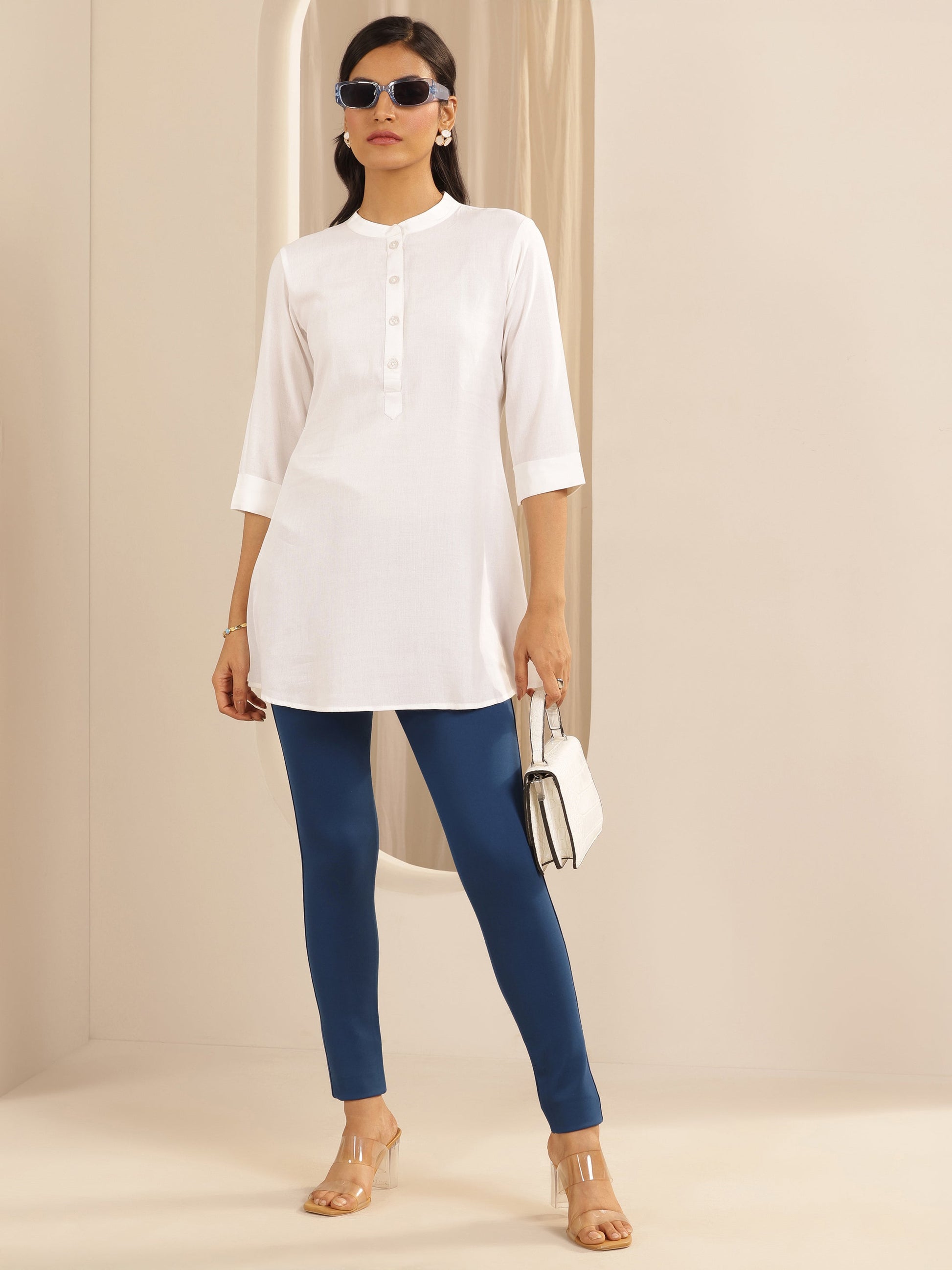 Our blue rayon blend trousers feature a mid-rise waist style with slip-on closure and 2 pockets. Adorned with solid embellishments, this intricate style is perfect for casual wear.
