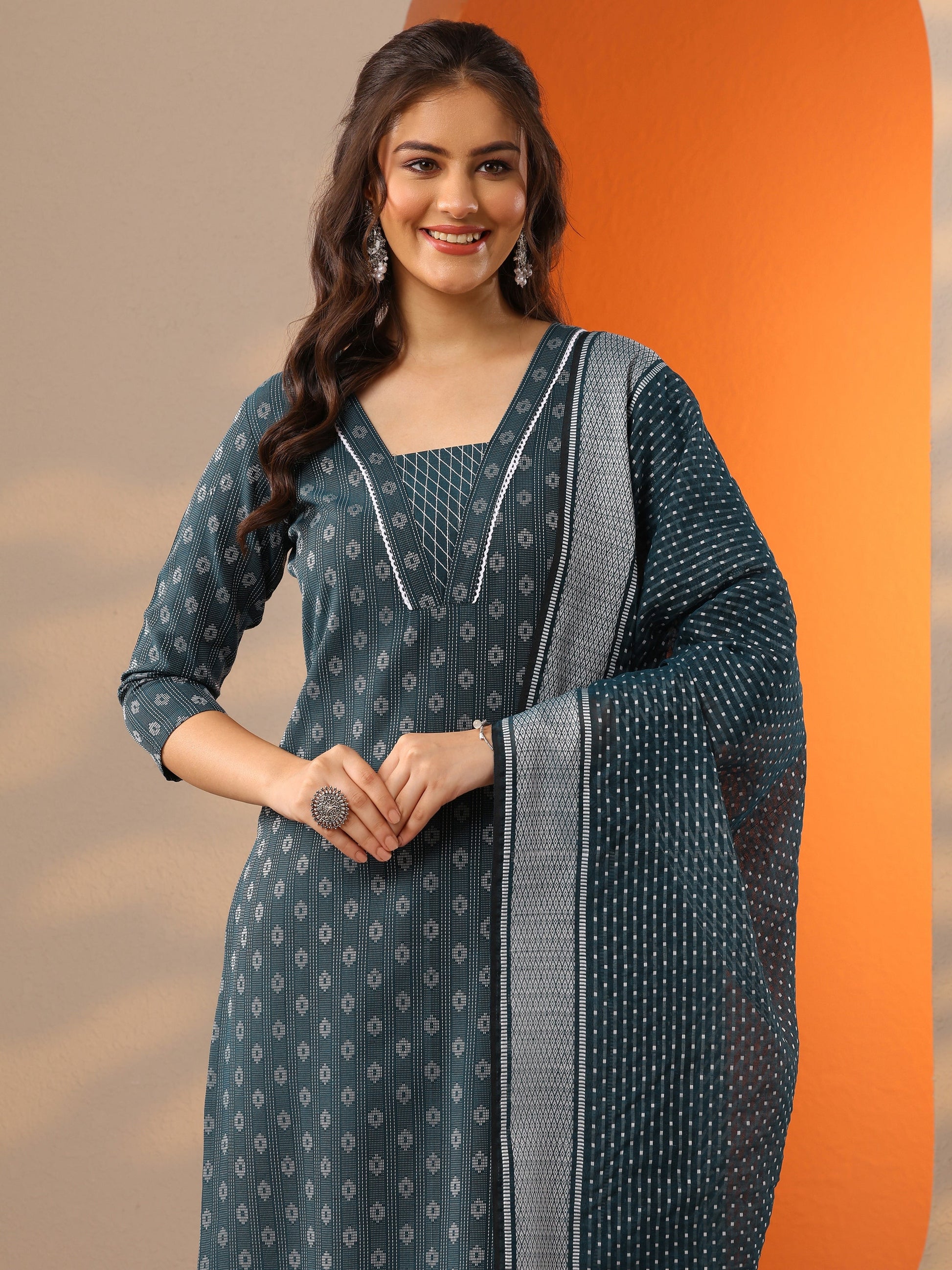 Teal Woven Design Cotton Blend Straight Suit Set With Dupatta
