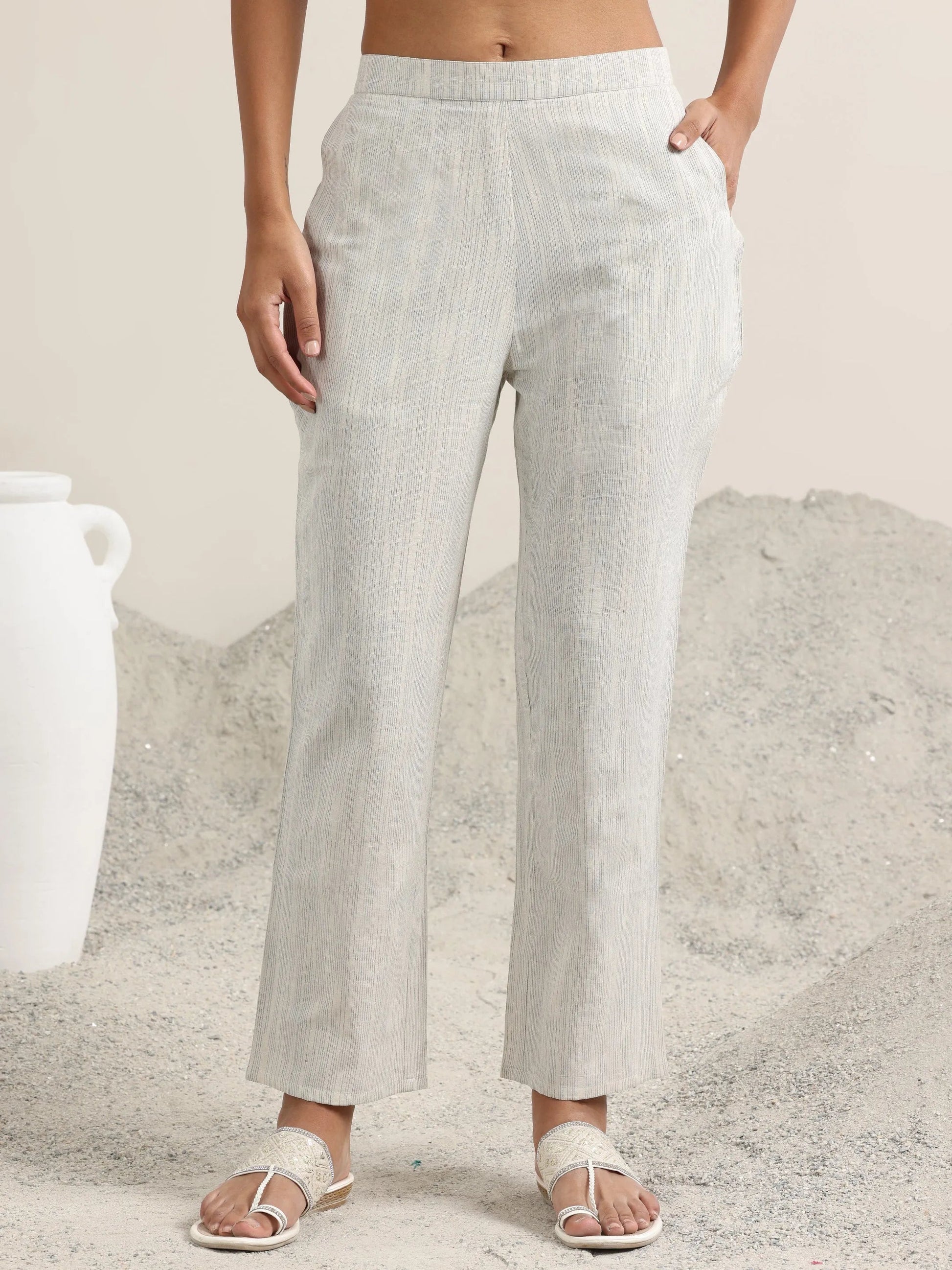 Our 3-piece teal green printed cotton blend straight suit set features a straight-fit kurta with a round neckline and three-quarter sleeves. Complemented with solid trousers with a partially elasticated waistband, roomy pockets, and a printed dupatta. Adorned with chevron prints, and fabric-trim accents, this refreshing style is perfect for daytime festivities.