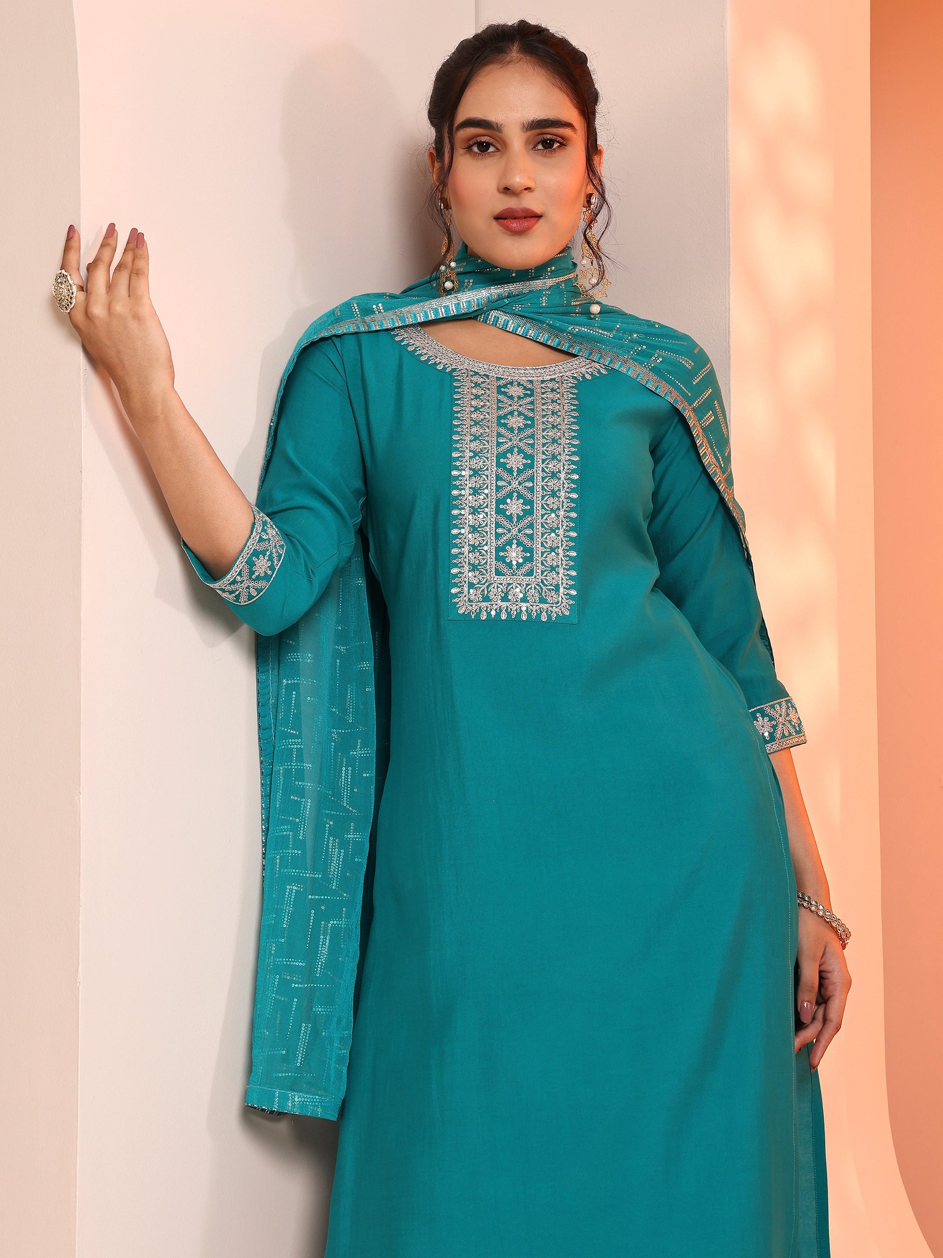 Teal Yoke Design Silk Blend Straight Suit Set With Dupatta
