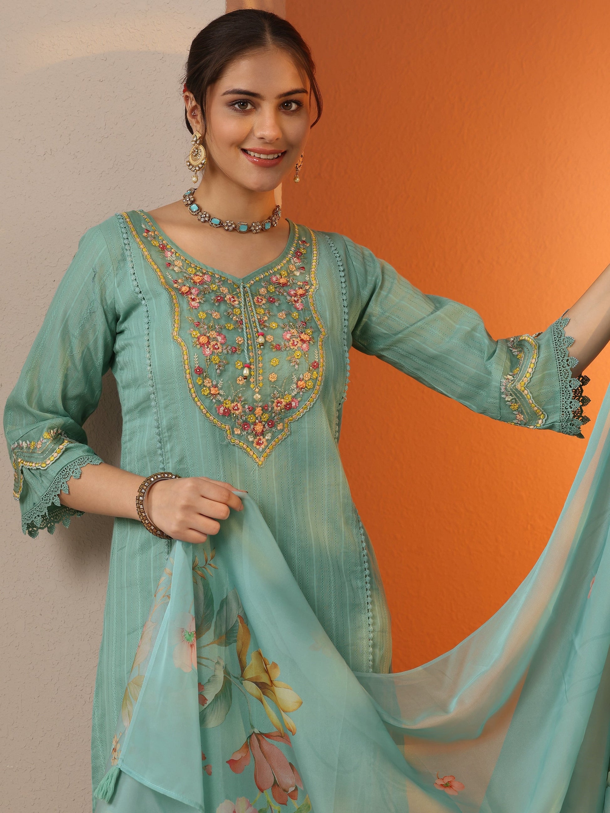Turquoise blue Embroidered Cotton Blend A-line Suit Set With Dupatta