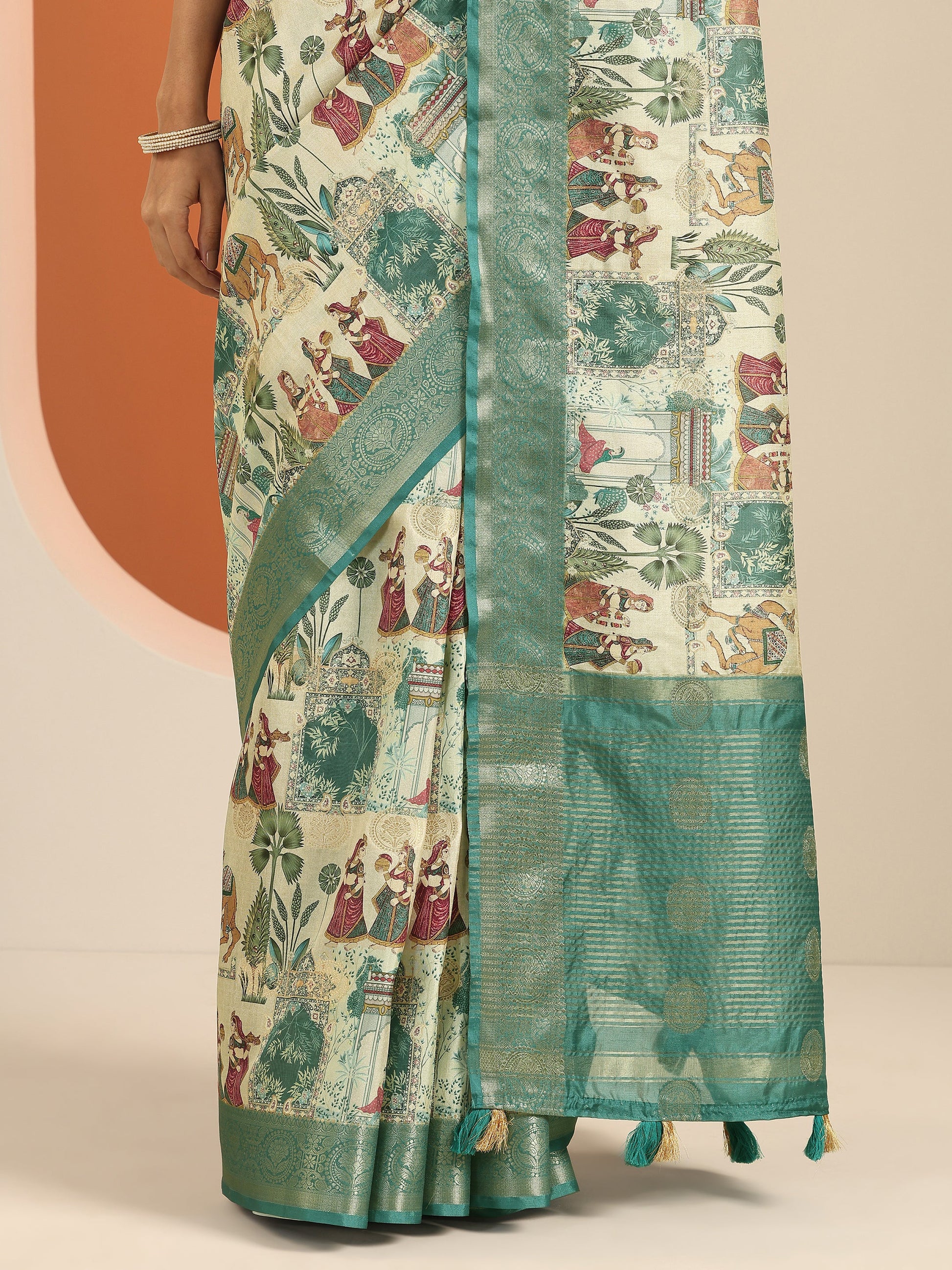 Our Turquoise Blue Printed Silk Blend Saree Features Captivating Tribal Printed Design. Complemented With A Unstitched Blouse Piece. This Charming Saree Is Perfect For Festive Wear.