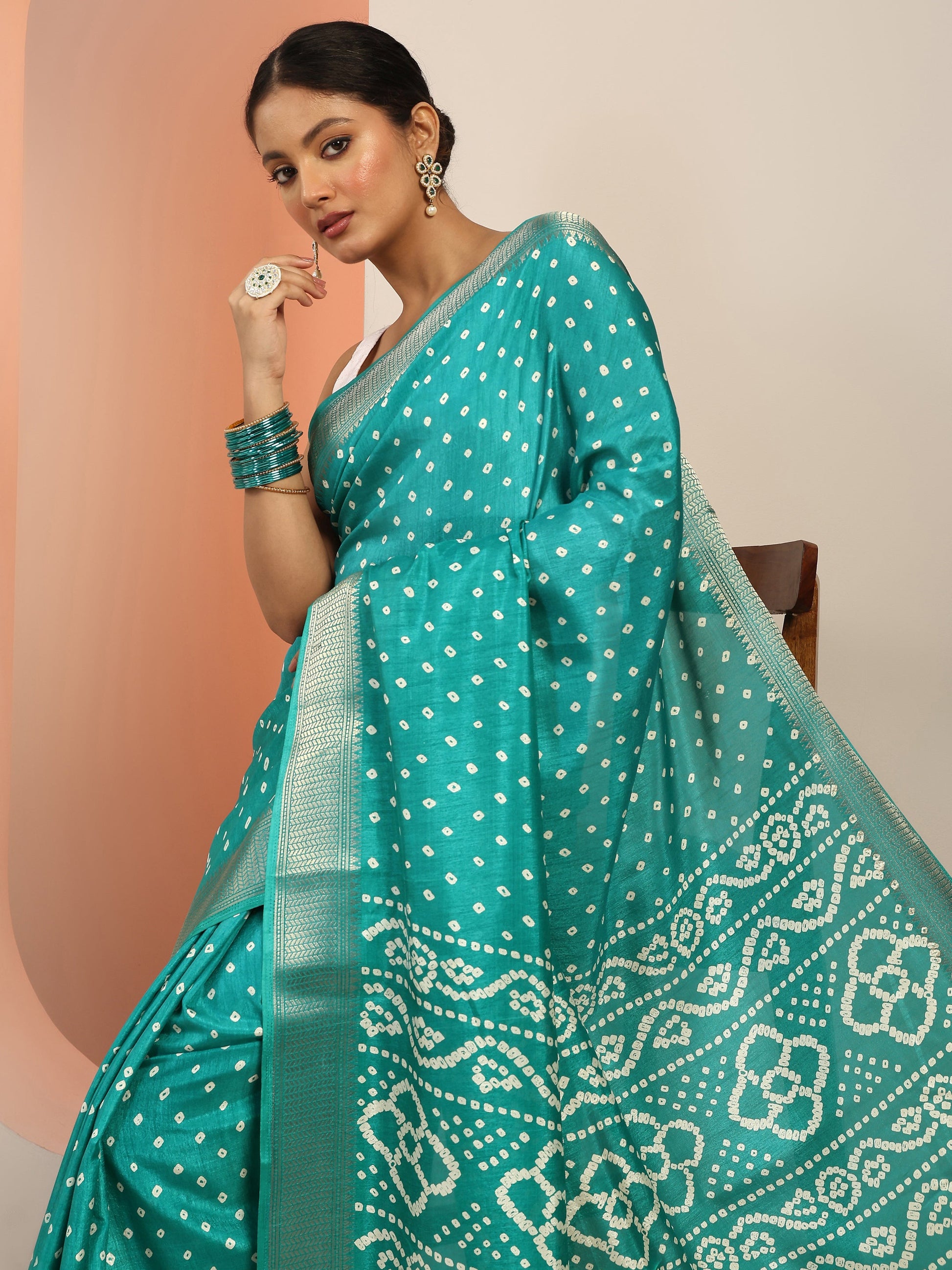 Our Turquoise Blue Printed Silk Blend Saree Features Captivating Bandhani Printed Design. Complemented With An Unstitched Blouse Piece. This Charming Saree Is Perfect For Festive Wear
