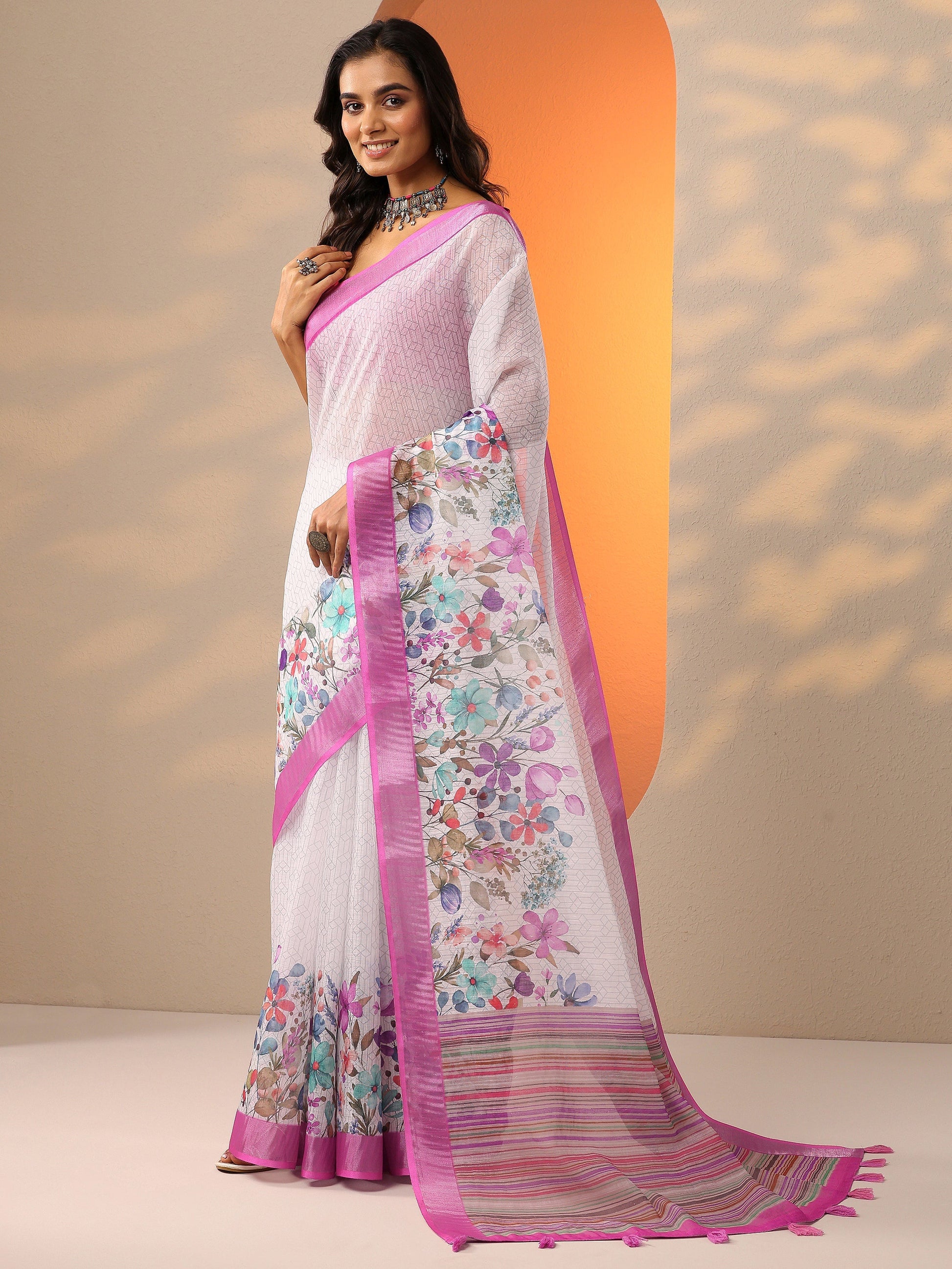 White Printed Cotton Blend Saree With Unstitched Blouse Piece