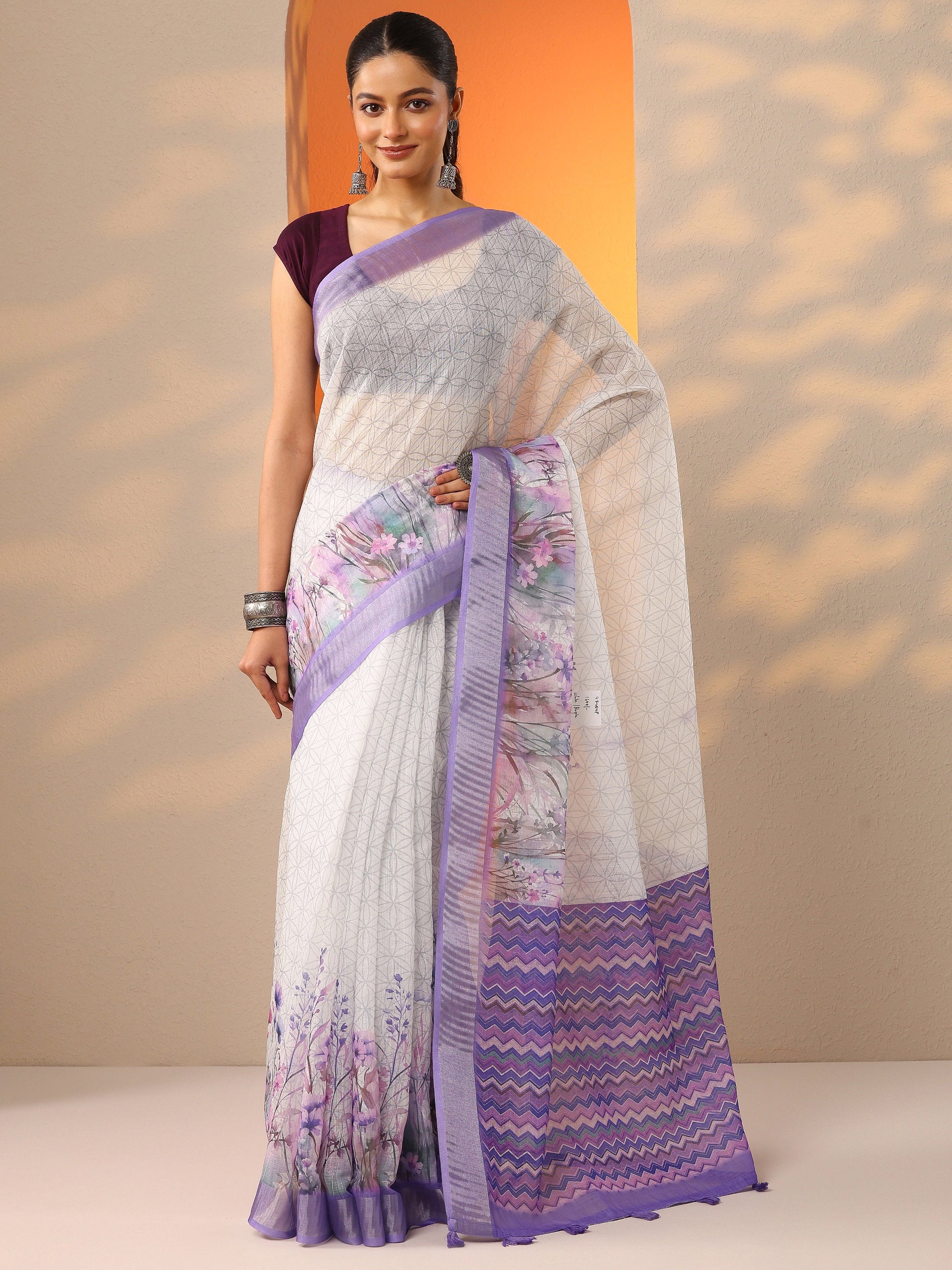 Our Purple Printed Cotton Blend Saree Features Captivating Floral Print. Complemented With An Unstitched Blouse Piece. This Charming Saree Is Perfect For Casual Wear.