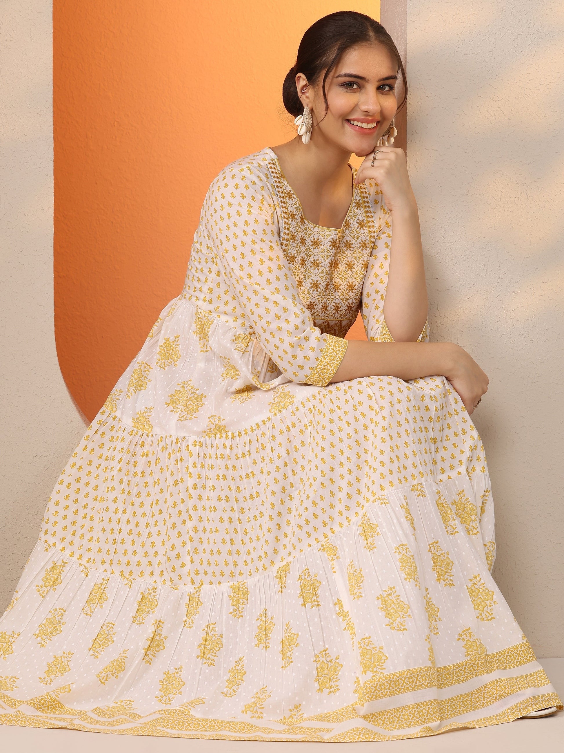 Our White and Yellow printed Cotton Midi dress features a Round Neckline, Three-Quarter Sleeves, and a Flared hemline. Highlighted with captivating Floral Printed, this style is perfect for casual wear.