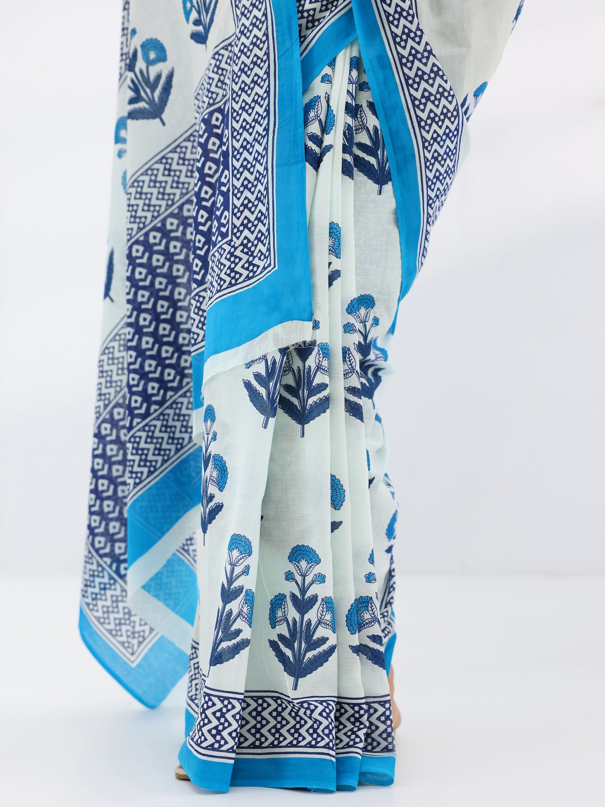 White Printed Cotton Saree With Unstitched Blouse Piece