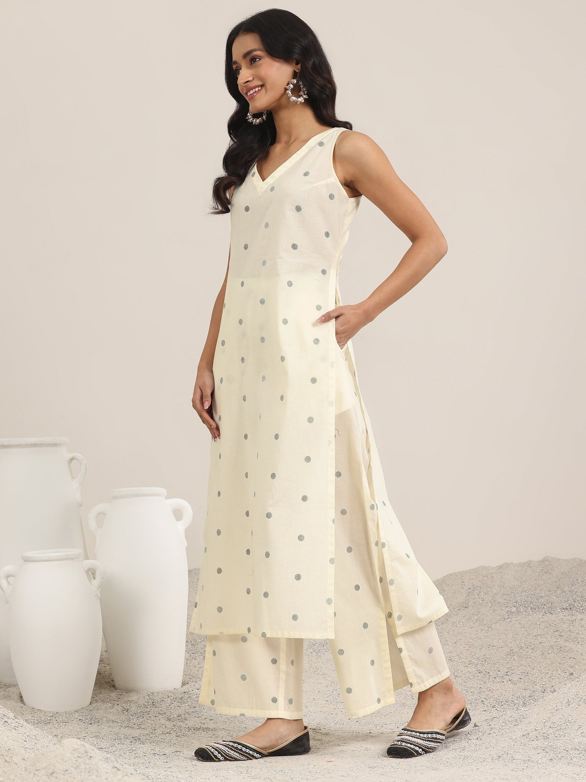 Our 2-piece white printed cotton straight kurta set features a sleeveless straight kurta with a V-neckline. Complemented with trousers with a partially elasticated waistband and roomy pockets. Highlighted with polka dots, this style is perfect for work and beyond.