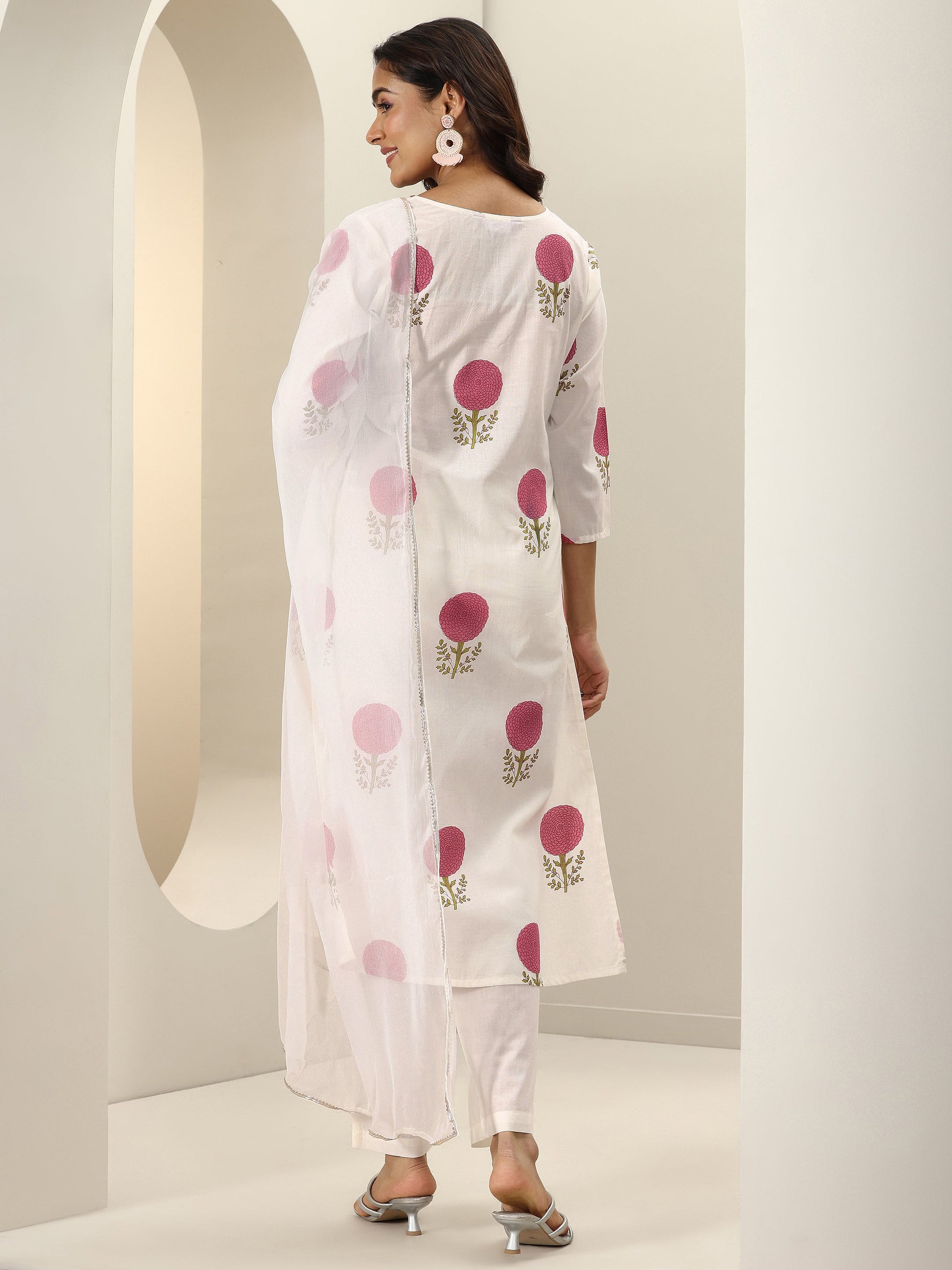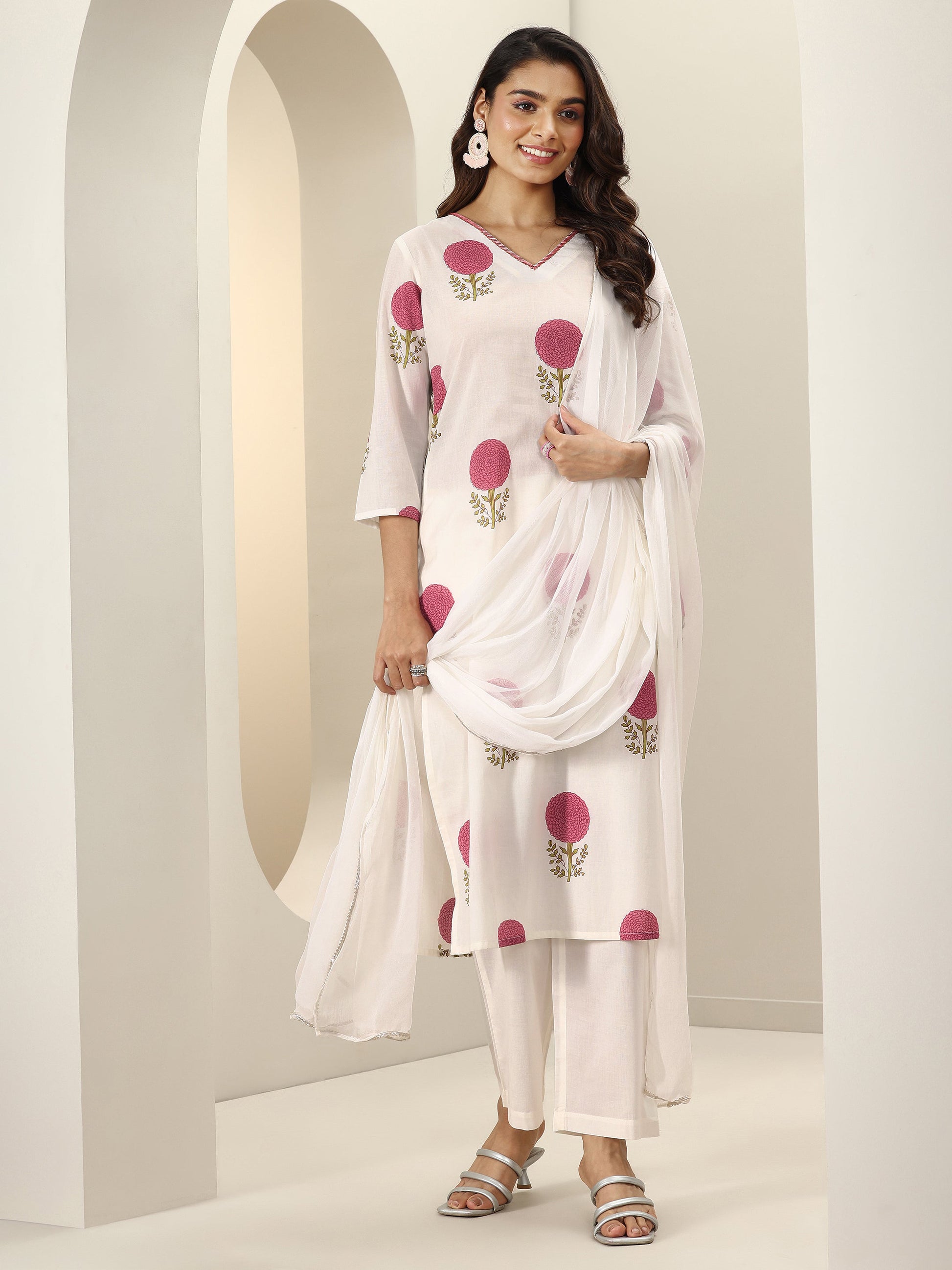 Our 3-piece off white pure cotton kurta set features a straight-fit kurta with a V-neckline, regular sleeves, and a statement yoke. Complemented with straight pants with an elasticated waistband and a solid dupatta. Adorned with printed accents, this style is perfect for casual occasions.
