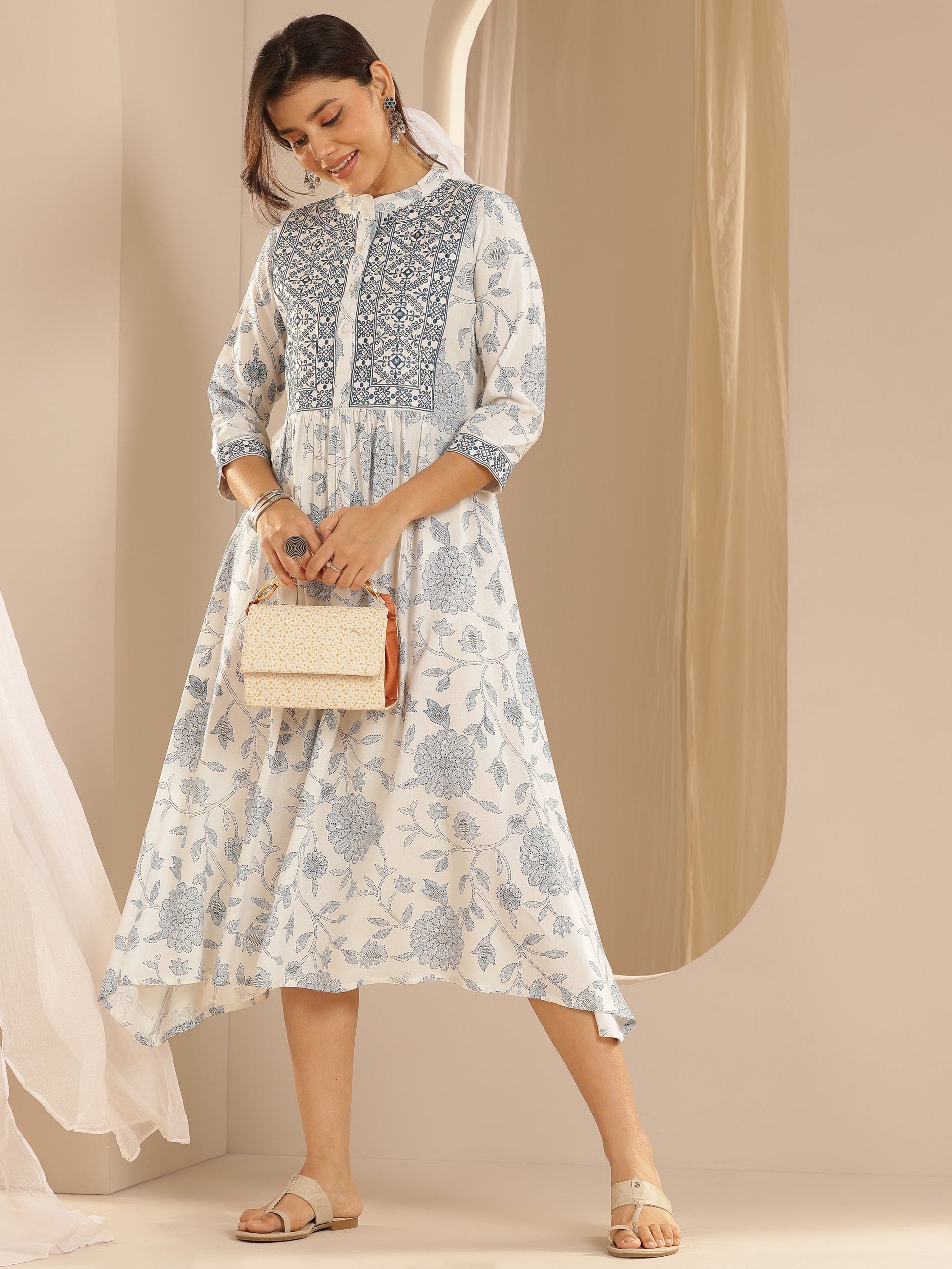 Our White and Blue printed Rayon Midi dress features a Shirt Collar neckline, Three-Quarter Sleeves, and a High-Low hemline. Highlighted with captivating Floral embellishments, this style is perfect for Casual wear.