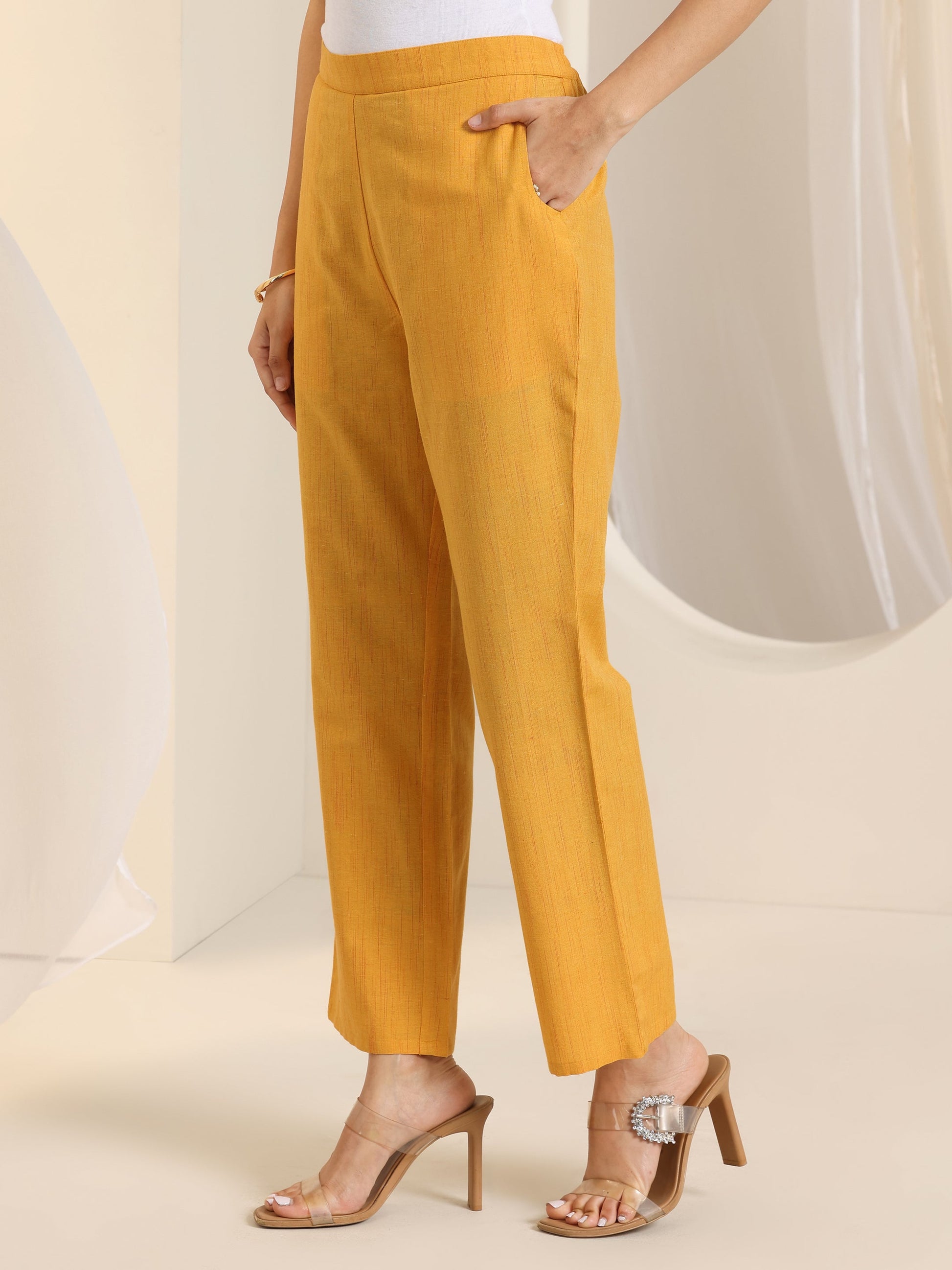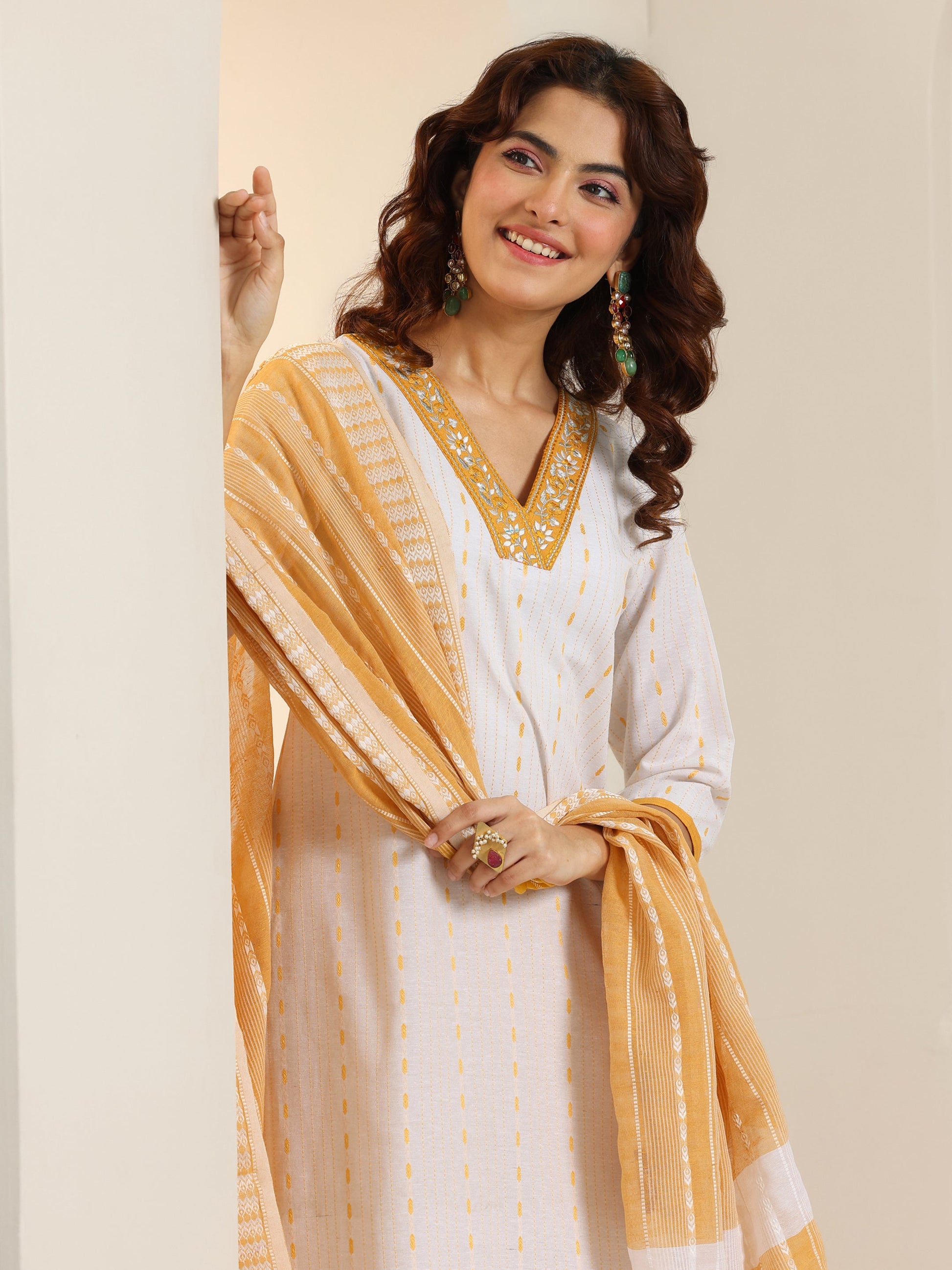 Our 3-piece white and yellow cotton blend kurta set features a straight-fit kurta with a V-neckline, regular sleeves, and statement yoke. Complemented with straight pants with an elasticated waistband and a printed dupatta. Adorned with self design, this style is perfect for casual occasions.