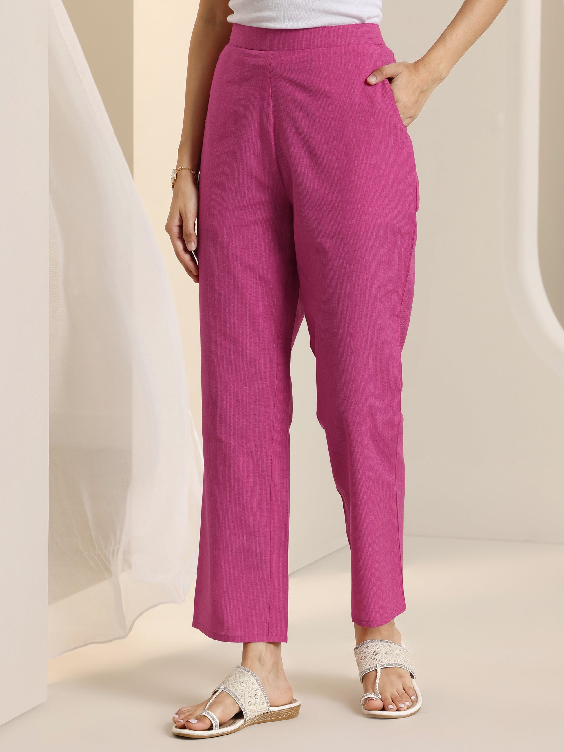 Our 3-piece white and pink cotton blend kurta set features a straight-fit kurta with a V-neckline, regular sleeves, and statement yoke. Complemented with straight pants with an elasticated waistband and a printed dupatta. Adorned with self design, this style is perfect for casual occasions.