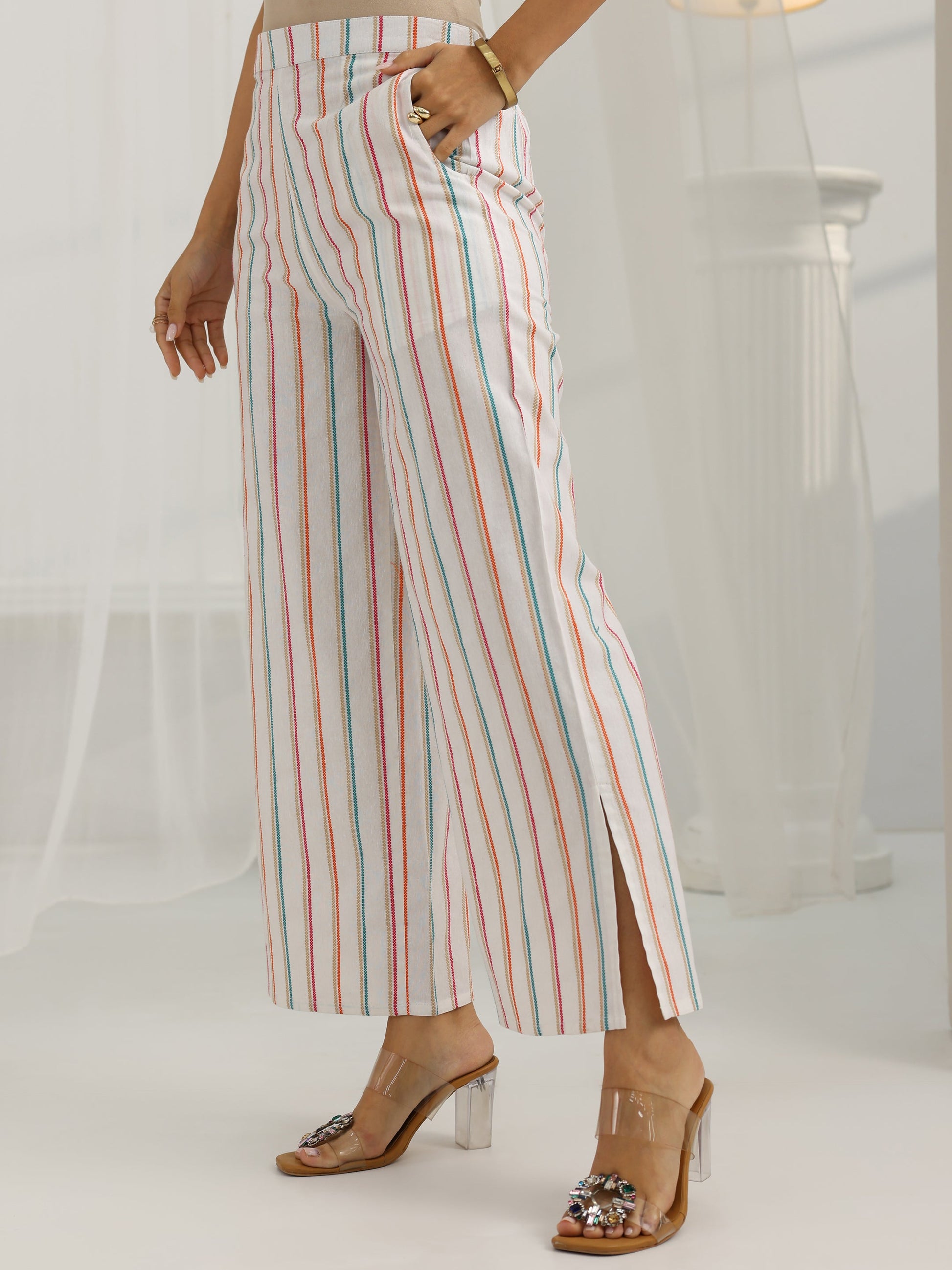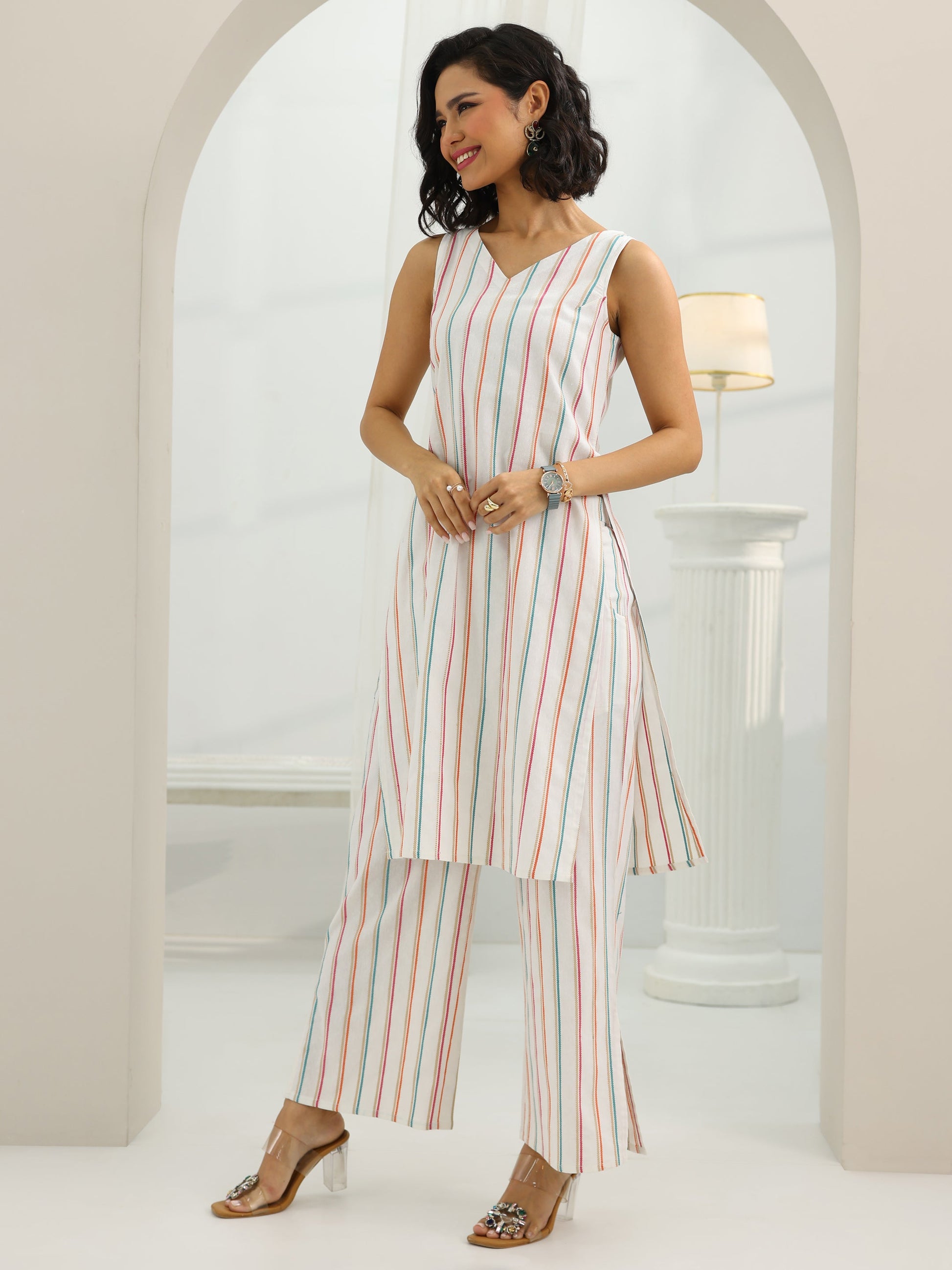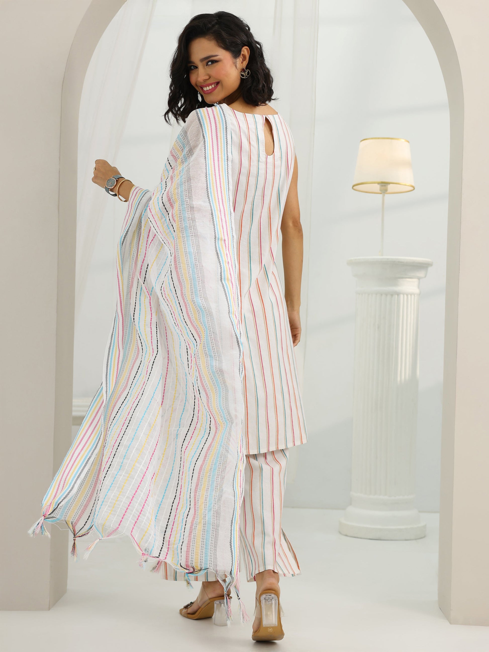 Our 3-piece white multi cotton blend straight-fit kurta set features a V-neckline, no sleeves shoulder, and statement yoke. Complemented with palazzo pants with a partially elasticated waistband and 2 pockets, and a striped dupatta. Adorned with a striped woven design, this style is perfect for casual wear.