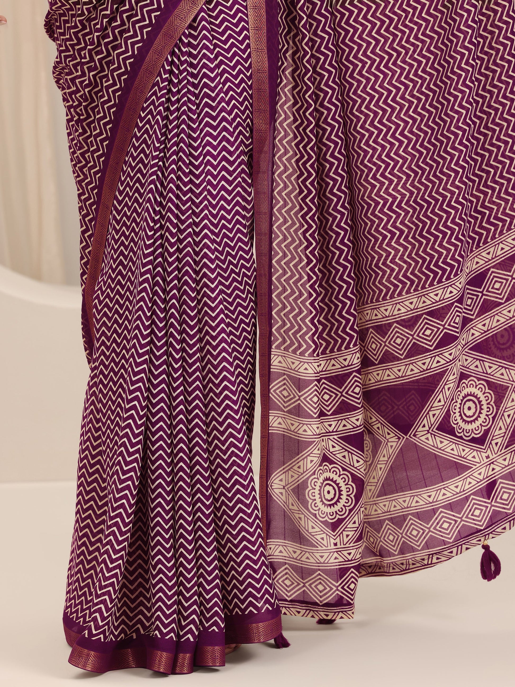 Our purple printed Georgette saree features captivating Chevron printed design. Complemented with a unstitched blouse piece. This charming saree is perfect for semi festive occasions.
